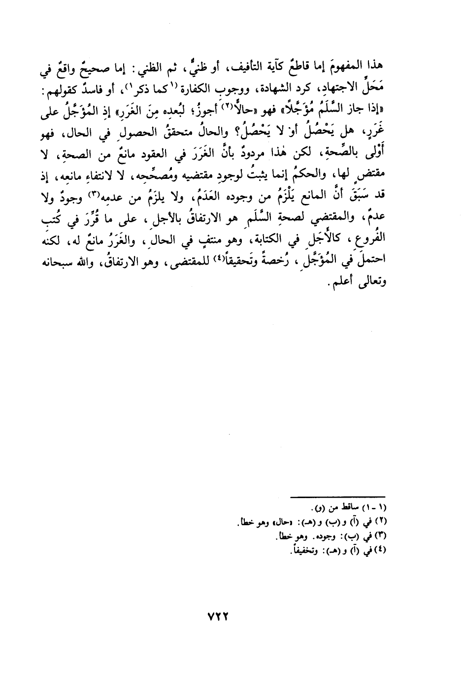 هَذَا الْمَفْهُومَ إِمَّا قَاطِعٌ كَآيَةِ التَّأْفِيفِ، أَوْ ظَنِّيٌّ، ثُمَّ الظَّنِّيُّ: إِمَّا صَحِيحٌ وَاقِعٌ فِي مَحَلِّ الِاجْتِهَادِ، كَرَدِّ الشَّهَادَةِ، وَوُجُوبِ الْكَفَّارَةِ كَمَا ذُكِرَ، أَوْ فَاسِدٌ كَقَوْلِهِمْ: «إِذَا جَازَ السَّلَمُ مُؤَجَّلًا» ; فَهُوَ «حَالًا أَجْوَزُ ; لِبُعْدِهِ مِنَ الْغَرَرِ» ، إِذِ الْمُؤَجَّلُ عَلَى غَرَرٍ، هَلْ يَحْصُلُ أَوْ لَا يَحْصُلُ؟ وَالْحَالُّ مُتَحَقِّقُ الْحُصُولِ فِي الْحَالِ ; فَهُوَ أَوْلَى بِالصِّحَّةِ، لَكِنَّ هَذَا مَرْدُودٌ بِأَنَّ الْغَرَرَ فِي الْعُقُودِ مَانِعٌ مِنَ الصِّحَّةِ، لَا مُقْتَضٍ لَهَا، وَالْحُكْمُ إِنَّمَا يَثْبُتُ لِوُجُودِ مُقْتَضِيهِ وَمُصَحِّحِهِ، لَا لِانْتِفَاءِ مَانِعِهِ، إِذْ قَدْ سَبَقَ أَنَّ الْمَانِعَ يَلْزَمُ مِنْ وُجُودِهِ الْعَدَمُ، وَلَا يَلْزَمُ مَنْ عَدِمِهِ وُجُودٌ وَلَا عَدَمٌ، وَالْمُقْتَضِي لِصِحَّةِ السِّلْمِ هُوَ الِارْتِفَاقُ بِالْأَجَلِ، عَلَى مَا قُرِّرَ فِي كُتُبِ الْفُرُوعِ، كَالْأَجَلِ فِي الْكِتَابَةِ، وَهُوَ مُنْتَفٍ فِي الْحَالِ، وَالْغَرَرُ مَانِعٌ لَهُ، لَكِنَّهُ احْتُمِلَ فِي الْمُؤَجَّلِ، رُخْصَةً وَتَحْقِيقًا لِلْمُقْتَضَى، وَهُوَ الِارْتِفَاقُ، وَاللَّهُ سُبْحَانَهُ وَتَعَالَى أَعْلَمُ.