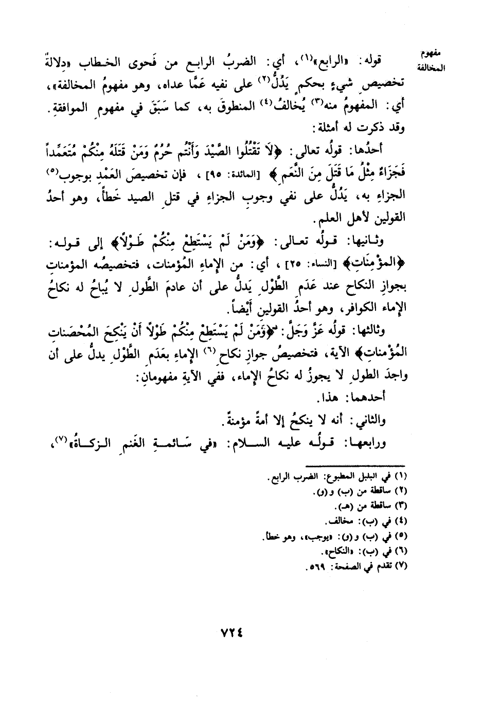 قَوْلُهُ: «الرَّابِعُ» ، أَيِ: الضَّرْبُ الرَّابِعُ مِنْ فَحْوَى الْخِطَابِ «دَلَالَةُ تَخْصِيصِ شَيْءٍ بِحُكْمٍ يَدُلُّ عَلَى نَفْيِهِ عَمَّا عَدَاهُ، وَهُوَ مَفْهُومُ الْمُخَالَفَةِ» ، أَيِ: الْمَفْهُومُ مِنْهُ يُخَالِفُ الْمَنْطُوقَ بِهِ، كَمَا سَبَقَ فِي مَفْهُومِ الْمُوَافَقَةِ. وَقَدْ ذَكَرْتُ لَهُ أَمْثِلَةً: