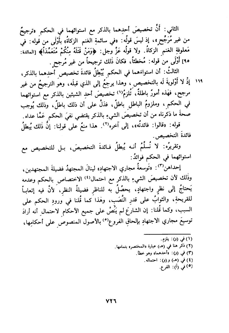 الثَّانِي: أَنَّ تَخْصِيصَ أَحَدِهِمَا بِالذِّكْرِ مَعَ اسْتِوَائِهِمَا فِي الْحُكْمِ «تَرْجِيحٌ مِنْ غَيْرِ مُرَجِّحٍ» ، إِذْ لَيْسَ قَوْلُهُ: فِي سَائِمَةِ الْغَنَمِ الزَّكَاةُ، بِأَوْلَى مِنْ قَوْلِهِ: فِي مَعْلُوفَةِ الْغَنَمِ الزَّكَاةُ. وَلَا قَوْلُهُ عَزَّ وَجَلَّ: {وَمَنْ قَتَلَهُ مِنْكُمْ مُتَعَمِّدًا} [الْمَائِدَةِ: 95] ، أَوْلَى مِنْ قَوْلِهِ: مُخْطِئًا ; فَكَانَ ذَلِكَ تَرْجِيحًا مِنْ غَيْرِ مُرَجِّحٍ.