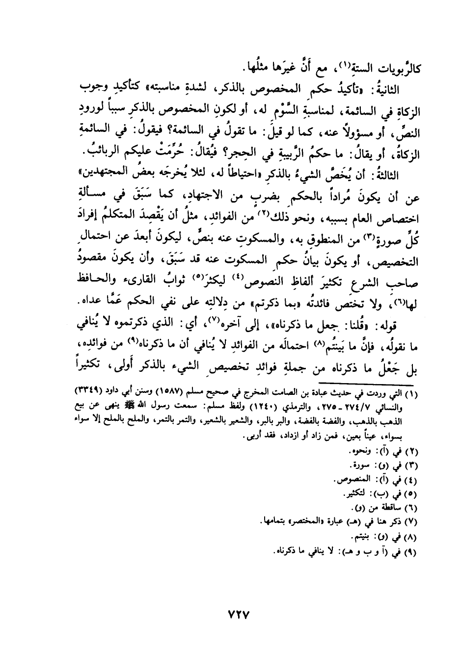 الثَّالِثَةُ: أَنْ يُخَصَّ الشَّيْءُ بِالذِّكْرِ «احْتِيَاطًا لَهُ، لِئَلَّا يُخْرِجَهُ بَعْضُ الْمُجْتَهِدِينَ» ، عَنْ أَنْ يَكُونَ مُرَادًا بِالْحُكْمِ بِضَرْبٍ مِنَ الِاجْتِهَادِ، كَمَا سَبَقَ فِي مَسْأَلَةِ اخْتِصَاصِ الْعَامِّ بِسَبَبِهِ، وَنَحْوِ ذَلِكَ مِنَ الْفَوَائِدِ، مِثْلَ أَنْ يَقْصِدَ الْمُتَكَلِّمُ إِفْرَادَ كُلِّ صُورَةٍ مِنَ الْمَنْطُوقِ بِهِ، وَالْمَسْكُوتِ عَنْهُ بِنَصٍّ، لِيَكُونَ أَبْعَدَ عَنِ احْتِمَالِ التَّخْصِيصِ، أَوْ يَكُونَ بَيَانُ حُكْمِ الْمَسْكُوتِ عَنْهُ قَدْ سَبَقَ، وَأَنْ يَكُونَ مَقْصُودُ صَاحِبِ الشَّرْعِ تَكْثِيرَ أَلْفَاظِ النُّصُوصِ لِيَكْثُرَ ثَوَابُ الْقَارِئِ وَالْحَافِظِ لَهَا، وَلَا تَخْتَصُّ فَائِدَتُهُ «بِمَا ذَكَرْتُمْ» مِنْ دَلَالَتِهِ عَلَى نَفْيِ الْحُكْمِ عَمَّا عَدَاهُ.