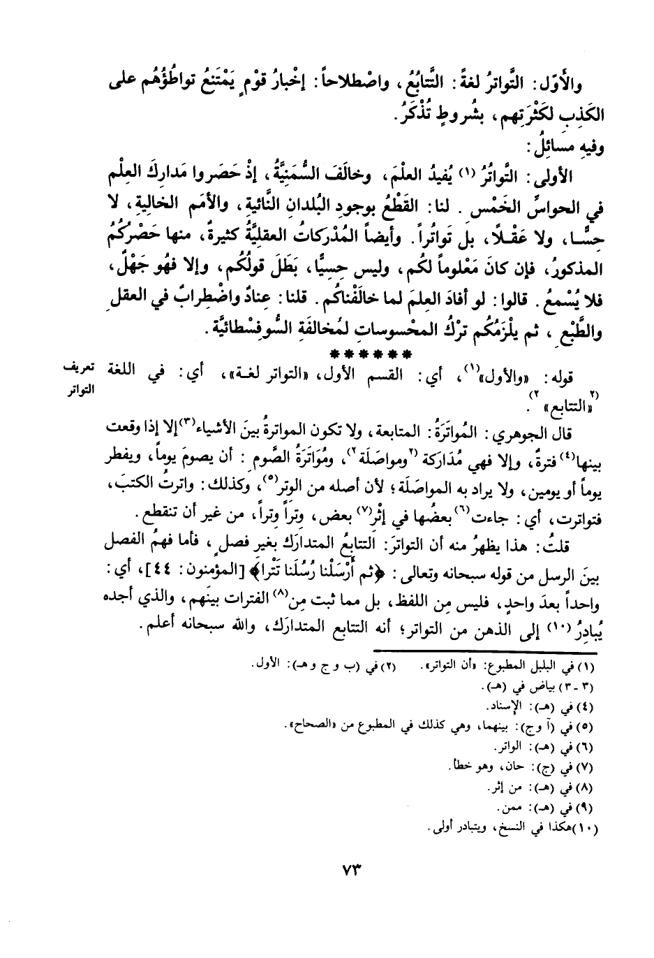 الْأُولَى: التَّوَاتُرُ يُفِيدُ الْعِلْمَ، وَخَالَفَ السُّمَنِيَّةُ، إِذْ حَصَرُوا مَدَارِكَ الْعِلْمِ فِي الْحَوَاسِّ الْخَمْسِ. لَنَا: الْقَطْعُ بِوُجُودِ الْبُلْدَانِ النَّائِيَةِ، وَالْأُمَمِ الْخَالِيَةِ، لَا حِسًّا، وَلَا عَقْلًا، بَلْ تَوَاتُرًا. وَأَيْضًا الْمُدْرَكَاتُ الْعَقْلِيَّةُ كَثِيرَةٌ، مِنْهَا حَصْرُكُمُ الْمَذْكُورَ، فَإِنْ كَانَ مَعْلُومًا لَكُمْ، وَلَيْسَ حِسِيًّا، بَطَلَ قَوْلُكُمْ، وَإِلَّا فَهُوَ جَهْلٌ ; فَلَا يُسْمَعُ. قَالُوا: لَوْ أَفَادَ الْعِلْمَ لَمَا خَالَفْنَاكُمْ. قُلْنَا: عِنَادٌ وَاضْطِرَابٌ فِي الْعَقْلِ وَالطَّبْعِ، ثُمَّ يَلْزَمُكُمْ تَرْكُ الْمَحْسُوسَاتِ لِمُخَالَفَةِ السُّوفِسْطَائِيَّةِ.