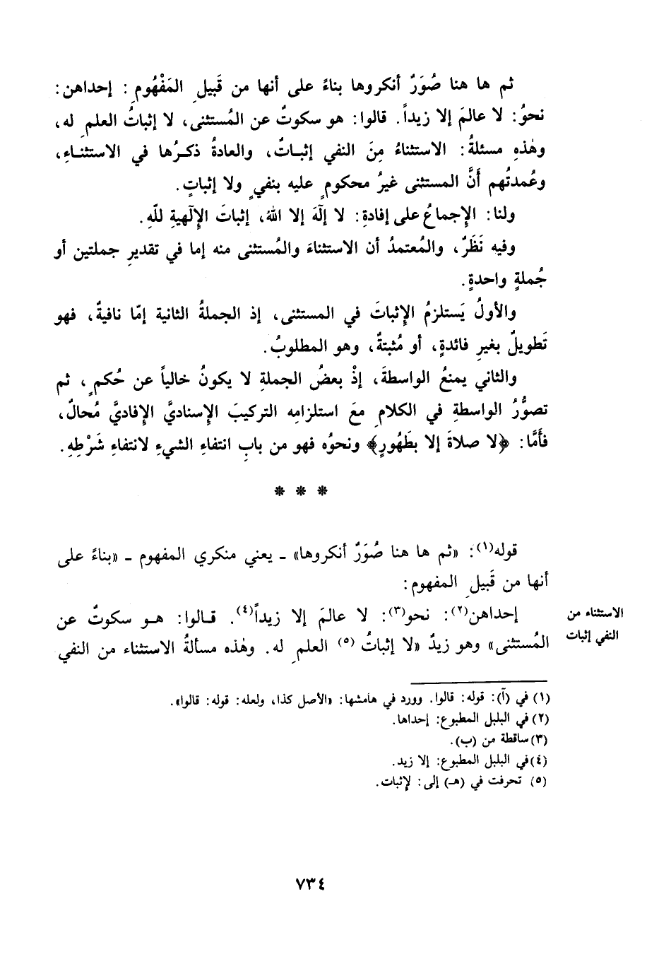 ثُمَّ هَهُنَا صُوَرٌ أَنْكَرُوهَا بِنَاءً عَلَى أَنَّهَا مِنْ قَبِيلِ الْمَفْهُومِ: إِحْدَاهُنَّ: نَحْوَ: لَا عَالِمَ إِلَّا زَيْدًا، قَالُوا: هُوَ سُكُوتٌ عَنِ الْمُسْتَثْنَى، لَا إِثْبَاتُ الْعِلْمِ لَهُ، وَهَذِهِ مَسْأَلَةُ: الِاسْتِثْنَاءِ مِنَ النَّفْيِ إِثْبَاتٌ، وَالْعَادَةُ ذِكْرُهَا فِي الِاسْتِثْنَاءِ، وَعُمْدَتُهُمْ أَنَّ الْمُسْتَثْنَى غَيْرُ مَحْكُومٍ عَلَيْهِ بِنَفْيٍ وَلَا إِثْبَاتٍ.