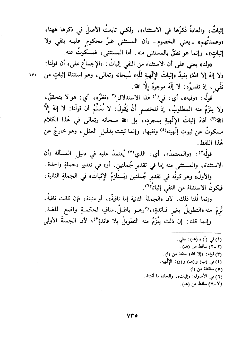 " وَلَنَا " يَعْنِي عَلَى أَنَّ الِاسْتِثْنَاءَ مِنَ النَّفْيِ إِثْبَاتٌ: " الْإِجْمَاعُ عَلَى أَنَّ قَوْلَنَا: لَا إِلَهَ إِلَّا اللَّهُ " يُفِيدُ " إِثْبَاتَ الْإِلَهِيَّةِ لِلَّهِ " سُبْحَانَهُ وَتَعَالَى، وَهُوَ اسْتِثْنَاءُ إِثْبَاتٍ مِنْ نَفْيٍ، إِذْ تَقْدِيرُهُ: لَا إِلَهَ مَوْجُودٌ إِلَّا اللَّهُ.