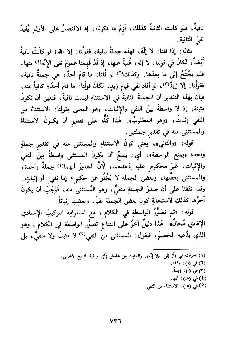قَوْلُهُ: " ثُمَّ تَصَوُّرُ الْوَاسِطَةِ فِي الْكَلَامِ، مَعَ اسْتِلْزَامِهِ التَّرْكِيبَ الْإِسْنَادِيَّ الْإِفَادِيَّ - مُحَالٌ ". هَذَا دَلِيلٌ آخَرُ عَلَى امْتِنَاعِ تَصَوُّرِ الْوَاسِطَةِ فِي الْكَلَامِ، وَهُوَ الَّذِي يَدَّعِيهِ الْخَصْمُ ; فَيَقُولُ: الْمُسْتَثْنَى مِنَ النَّفْيِ لَا مُثْبَتٌ وَلَا مَنْفِيٌّ، بَلْ