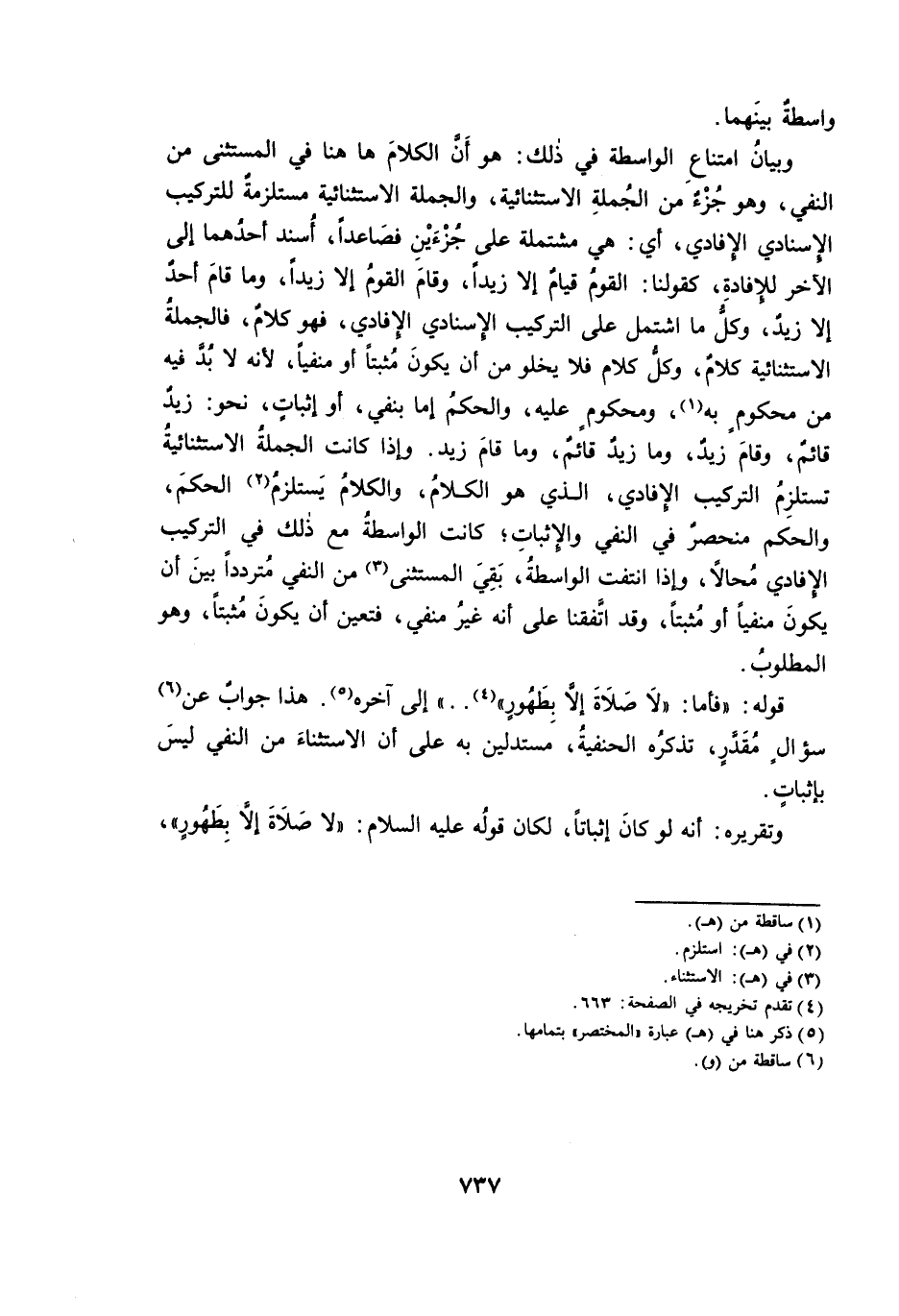 وَبَيَانُ امْتِنَاعِ الْوَاسِطَةِ فِي ذَلِكَ: هُوَ أَنَّ الْكَلَامَ هَهُنَا فِي الْمُسْتَثْنَى مِنَ النَّفْيِ، وَهُوَ جُزْءٌ مِنَ الْجُمْلَةِ الِاسْتِثْنَائِيَّةِ، وَالْجُمْلَةُ الِاسْتِثْنَائِيَّةُ مُسْتَلْزِمَةٌ لِلتَّرْكِيبِ الْإِسْنَادِيِّ الْإِفَادِيِّ، أَيْ: هِيَ مُشْتَمِلَةٌ عَلَى جُزْءَيْنِ فَصَاعِدًا، أُسْنِدَ أَحَدُهُمَا إِلَى الْآخَرِ لِلْإِفَادَةِ، كَقَوْلِنَا: الْقَوْمُ قِيَامٌ إِلَّا زَيْدًا، وَقَامَ الْقَوْمُ إِلَّا زَيْدًا، وَمَا قَامَ أَحَدٌ إِلَّا زَيْدٌ، وَكُلُّ مَا اشْتَمَلَ عَلَى التَّرْكِيبِ الْإِسْنَادِيِّ الْإِفَادِيِّ ; فَهُوَ كَلَامٌ ; فَالْجُمْلَةُ الِاسْتِثْنَائِيَّةُ كَلَامٌ، وَكُلُّ كَلَامٍ فَلَا يَخْلُو مِنْ أَنْ يَكُونَ مُثْبَتًا أَوْ مَنْفِيًّا ; لِأَنَّهُ لَابُدَ فِيهِ مِنْ مَحْكُومٍ بِهِ، وَمَحْكُومٍ عَلَيْهِ، وَالْحُكْمُ إِمَّا بِنَفْيٍ، أَوْ إِثْبَاتٍ، نَحْوَ: زَيْدٌ قَائِمٌ، وَقَامَ زَيْدٌ، وَمَا زَيْدٌ قَائِمٌ، وَمَا قَامَ زَيْدٌ. وَإِذَا كَانَتِ الْجُمْلَةُ الِاسْتِثْنَائِيَّةُ تَسْتَلْزِمُ التَّرْكِيبَ الْإِفَادِيَّ، الَّذِي هُوَ الْكَلَامُ، وَالْكَلَامُ يَسْتَلْزِمُ الْحُكْمَ، وَالْحُكْمُ مُنْحَصِرٌ فِي النَّفْيِ وَالْإِثْبَاتِ، كَانَتِ الْوَاسِطَةُ مَعَ ذَلِكَ فِي التَّرْكِيبِ الْإِفَادِيِّ مُحَالًا، وَإِذَا انْتَفَتِ الْوَاسِطَةُ، بَقِيَ الْمُسْتَثْنَى مِنَ النَّفْيِ مُتَرَدِّدًا بَيْنَ أَنْ يَكُونَ مَنْفِيًّا أَوْ مُثْبَتًا، وَقَدِ اتَّفَقْنَا عَلَى أَنَّهُ غَيْرُ مَنْفِيٍّ ; فَتَعَيَّنَ أَنْ يَكُونَ مُثْبَتًا، وَهُوَ الْمَطْلُوبُ.