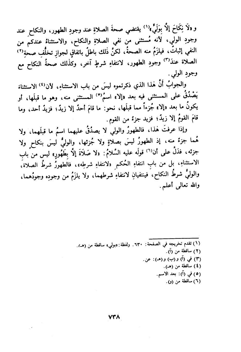 وَلَا نِكَاحَ إِلَّا بِوَلِيٍّ يَقْتَضِي صِحَّةَ الصَّلَاةِ عِنْدَ وُجُودِ الطَّهُورِ، وَالنِّكَاحِ عِنْدَ وُجُودِ الْوَلِيِّ ; لِأَنَّهُ مُسْتَثْنًى مِنْ نَفْيِ الصَّلَاةِ وَالنِّكَاحِ، وَالِاسْتِثْنَاءُ عِنْدَكُمْ مِنَ النَّفْيِ إِثْبَاتٌ ; فَيَلْزَمُ مِنْهُ الصِّحَّةُ، لَكِنَّ ذَلِكَ بَاطِلٌ بِاتِّفَاقٍ لِجَوَازِ تَخَلُّفِ صِحَّةِ الصَّلَاةِ عِنْدَ وُجُودِ الطَّهُورِ، لِانْتِفَاءِ شَرْطٍ آخَرَ، وَكَذَلِكَ صِحَّةُ النِّكَاحِ مَعَ وُجُودِ الْوَلِيِّ.