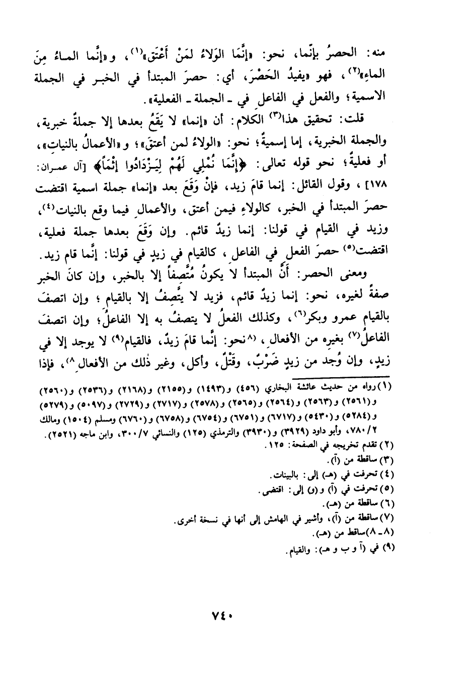 قُلْتُ: تَحْقِيقُ هَذَا الْكَلَامِ: أَنَّ إِنَّمَا لَا يَقَعُ بَعْدَهَا إِلَّا جُمْلَةٌ خَبَرِيَّةٌ، وَالْجُمْلَةُ الْخَبَرِيَّةُ ; إِمَّا اسْمِيَّةٌ، نَحْوَ: الْوَلَاءُ لِمَنْ أَعْتَقَ، وَالْأَعْمَالُ بِالنِّيَّاتِ. أَوْ فِعْلِيَّةٌ، نَحْوَ قَوْلِهِ تَعَالَى: {إِنَّمَا نُمْلِي لَهُمْ لِيَزْدَادُوا إِثْمًا} [آلِ عِمْرَانَ: 178] ، وَقَوْلِ الْقَائِلِ: إِنَّمَا قَامَ زَيْدٌ، فَإِنْ وَقَعَ بَعْدَ إِنَّمَا جُمْلَةٌ إِسْمِيَّةٌ اقْتَضَتْ حَصْرَ الْمُبْتَدَأِ فِي الْخَبَرِ، كَالْوَلَاءِ فِيمَنْ أَعْتَقَ، وَالْأَعْمَالِ فِيمَا وَقَعَ بِالنِّيَّاتِ، وَزَيْدٍ فِي الْقِيَامِ فِي قَوْلِنَا: إِنَّمَا زَيْدٌ قَائِمٌ. وَإِنْ وَقَعَ بَعْدَهَا جُمْلَةٌ فِعْلِيَّةٌ، اقْتَضَتْ حَصْرَ الْفِعْلِ فِي الْفَاعِلِ، كَالْقِيَامِ فِي زَيْدٍ فِي قَوْلِنَا: إِنَّمَا قَامَ زَيْدٌ.