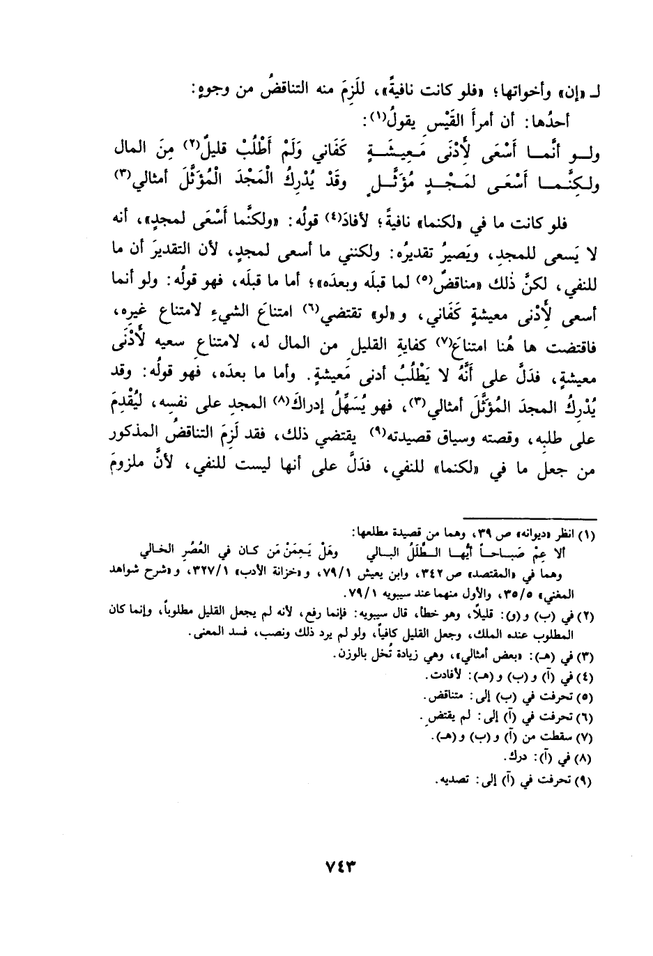 فَلَوْ كَانَتْ مَا فِي «لَكِنَّمَا» نَافِيَةً، لَأَفَادَ قَوْلُهُ: وَلَكِنَّمَا أَسْعَى لِمَجْدٍ، أَنَّهُ لَا يَسْعَى لِلْمَجْدِ، وَيَصِيرُ تَقْدِيرُهُ: وَلَكِنَّنِي مَا أَسْعَى لِمَجْدٍ ; لِأَنَّ التَّقْدِيرَ أَنَّ مَا لِلنَّفْيِ، لَكِنَّ ذَلِكَ «مُنَاقِضٌ لِمَا قَبْلَهُ وَبَعْدَهُ» ، أَمَّا مَا قَبْلَهُ ; فَهُوَ قَوْلُهُ: وَلَوْ أَنَمَا أَسْعَى لِأَدْنَى مَعِيشَةٍ كَفَانِي، وَ «لَوْ» تَقْتَضِي امْتِنَاعَ الشَّيْءِ لِامْتِنَاعِ غَيْرِهِ ; فَاقْتَضَتْ هَهُنَا امْتِنَاعَ كِفَايَةِ الْقَلِيلِ مِنَ الْمَالِ لَهُ، لِامْتِنَاعِ سَعْيِهِ لِأَدْنَى مَعِيشَةٍ ; فَدَلَّ عَلَى أَنَّهُ لَا يَطْلُبُ أَدْنَى مَعِيشَةٍ. وَأَمَّا مَا بَعْدَهُ ; فَهُوَ قَوْلُهُ: وَقَدْ يُدْرِكُ الْمَجْدَ الْمُؤَثَّلَ أَمْثَالِي ; فَهُوَ يُسَهِّلُ إِدْرَاكَ الْمَجْدِ عَلَى نَفْسِهِ، لِيُقْدِمَ عَلَى طَلَبِهِ، وَقِصَّتُهُ وَسِيَاقُ قَصِيدَتِهِ يَقْتَضِي ذَلِكَ ; فَقَدْ لَزِمَ التَّنَاقُضُ الْمَذْكُورُ مَنْ جَعَلَ مَا فِي «لَكِنَّمَا» لِلنَّفْيِ ; فَدَلَّ عَلَى أَنَّهَا لَيْسَتْ لِلنَّفْيِ ; لِأَنَّ مَلْزُومَ