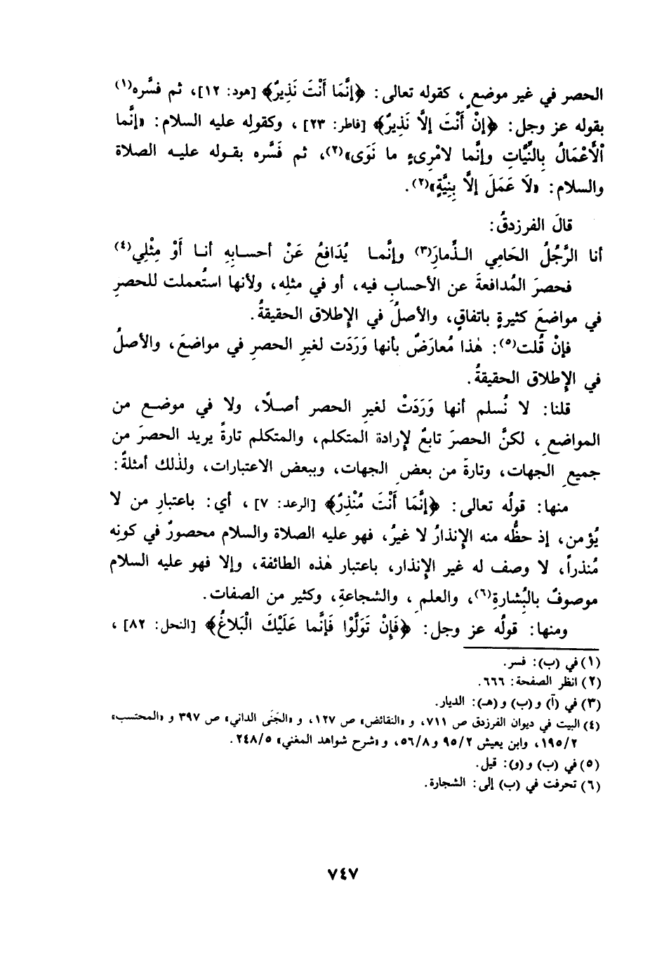 الْحَصْرِ فِي غَيْرِ مَوْضِعٍ، كَقَوْلِهِ تَعَالَى: {إِنَّمَا أَنْتَ نَذِيرٌ} [هُودٍ: 12] ، ثُمَّ فَسَّرَهُ بِقَوْلِهِ عَزَّ وَجَلَّ: {إِنْ أَنْتَ إِلَّا نَذِيرٌ} [فَاطِرٍ: 23] ، وَكَقَوْلِهِ عَلَيْهِ السَّلَامُ: إِنَّمَا الْأَعْمَالُ بِالنِّيَّاتِ وَإِنَّمَا لِامْرِئٍ مَا نَوَى، ثُمَّ فَسَّرَهُ بِقَوْلِهِ عَلَيْهِ الصَّلَاةُ وَالسَّلَامُ: لَا عَمَلَ إِلَّا بِنِيَّةٍ.