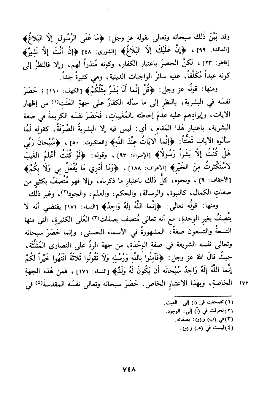وَمِنْهَا: قَوْلُهُ عَزَّ وَجَلَّ: {قُلْ إِنَّمَا أَنَا بَشَرٌ مِثْلُكُمْ} [الْكَهْفِ: 110] ، حَصَرَ نَفْسَهُ فِي الْبَشَرِيَّةِ، بِالنَّظَرِ إِلَى مَا سَأَلَهُ الْكُفَّارُ عَلَى جِهَةِ الْعَنَتِ مِنْ إِظْهَارِ الْآيَاتِ، وَإِيرَادِهِمْ عَلَيْهِ عَدَمَ إِحَاطَتِهِ بِالْمُغَيَّبَاتِ ; فَحَصَرَ نَفْسَهُ الْكَرِيمَةَ فِي صِفَةِ الْبَشَرِيَّةِ، بِاعْتِبَارِ هَذَا الْمَقَامِ، أَيْ: لَيْسَ فِيهِ إِلَّا الْبَشَرِيَّةُ الصِّرْفَةُ، كَقَوْلِهِ لَمَّا سَأَلُوهُ الْآيَاتِ تَعَنُّتًا: {إِنَّمَا الْآيَاتُ عِنْدَ اللَّهِ} [الْعَنْكَبُوتِ: 50] ، {سُبْحَانَ رَبِّي هَلْ كُنْتُ إِلَّا بَشَرًا رَسُولًا} [الْإِسْرَاءِ: 93] ، وَقَوْلِهِ: {وَلَوْ كُنْتُ أَعْلَمُ الْغَيْبَ لَاسْتَكْثَرْتُ مِنَ الْخَيْرِ} [الْأَعْرَافِ: 188] ، {وَمَا أَدْرِي مَا يُفْعَلُ بِي وَلَا بِكُمْ} [الْأَحْقَافِ: 9] ، وَنَحْوِهُ، كُلُّ ذَلِكَ بِاعْتِبَارِ مَا ذَكَرْنَاهُ، وَإِلَّا فَهُوَ مُتَّصِفٌ بِكَثِيرٍ مِنْ صِفَاتِ الْكَمَالِ، كَالنُّبُوَّةِ، وَالرِّسَالَةِ، وَالْحُكْمِ، وَالْعِلْمِ، وَالْجُودِ، وَغَيْرِ ذَلِكَ.