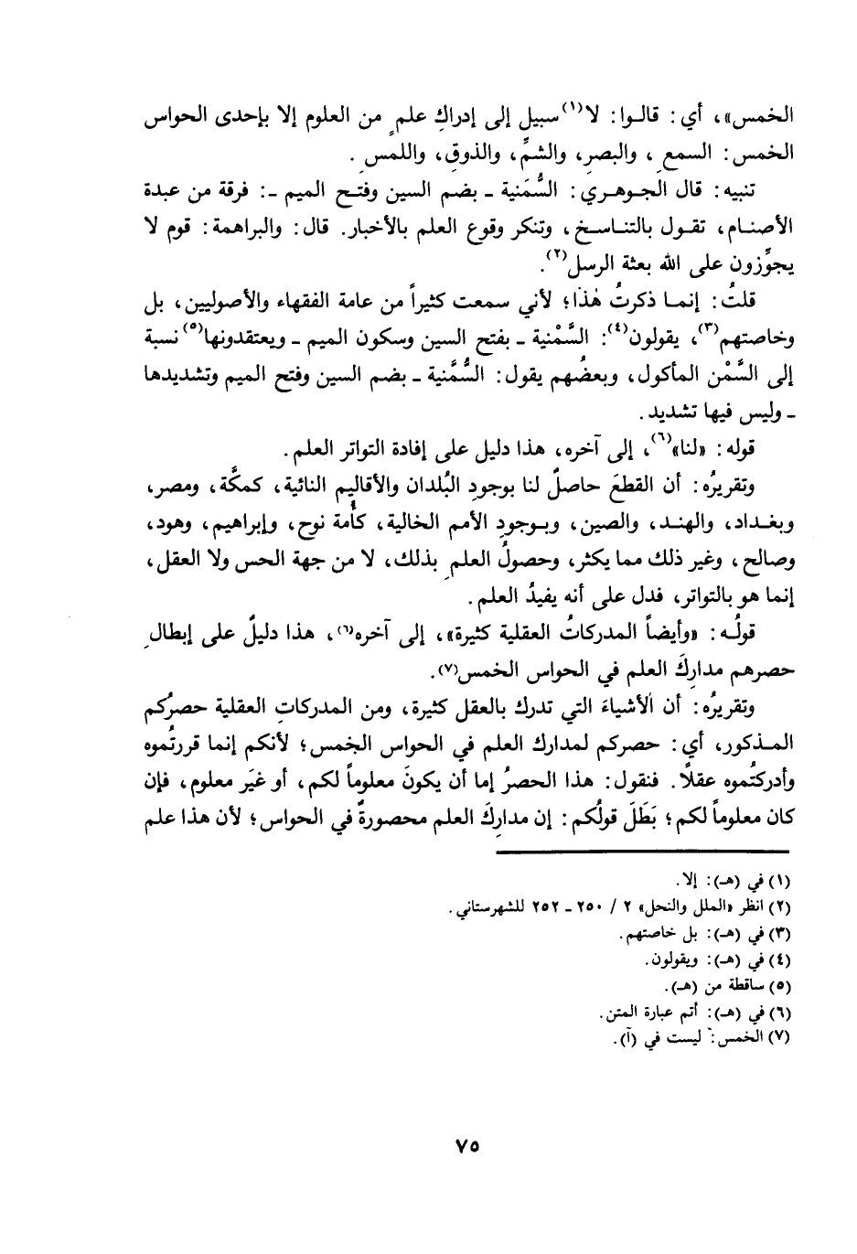 قَوْلُهُ: «وَأَيْضًا الْمُدْرَكَاتُ الْعَقْلِيَّةُ كَثِيرَةٌ» ، إِلَى آخِرِهِ، هَذَا دَلِيلٌ عَلَى إِبْطَالِ حَصْرِهِمْ مَدَارِكَ الْعِلْمِ فِي الْحَوَاسِّ الْخَمْسِ.
