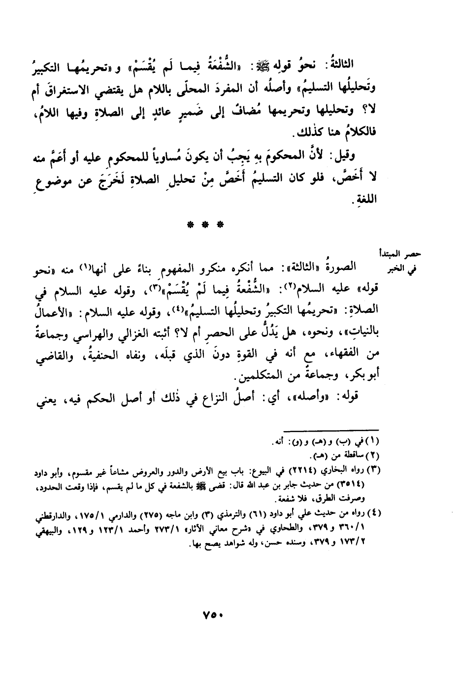 الصُّورَةُ " الثَّالِثَةُ ": مِمَّا أَنْكَرَهُ مُنْكِرُو الْمَفْهُومِ بِنَاءً عَلَى أَنَّهَا مِنْهُ " نَحْوَ قَوْلِهِ عَلَيْهِ السَّلَامُ: الشُّفْعَةُ فِيمَا لَمْ يُقْسَمْ، وَقَوْلِهِ عَلَيْهِ السَّلَامُ فِي الصَّلَاةِ: تَحْرِيمُهَا التَّكْبِيرُ وَتَحْلِيلُهَا التَّسْلِيمُ، وَقَوْلِهِ عَلَيْهِ السَّلَامُ: الْأَعْمَالُ بِالنِّيَّاتِ، وَنَحْوِهُ، هَلْ يَدُلُّ عَلَى الْحَصْرِ أَمْ لَا؟ أَثْبَتَهُ الْغَزَّالِيُّ وَالْهَرَّاسِيُّ وَجَمَاعَةٌ مِنَ الْفُقَهَاءِ، مَعَ أَنَّهُ فِي الْقُوَّةِ دُونَ الَّذِي قَبْلَهُ، وَنَفَاهُ الْحَنَفِيَّةُ، وَالْقَاضِي أَبُو بَكْرٍ، وَجَمَاعَةٌ مِنَ الْمُتَكَلِّمِينَ.