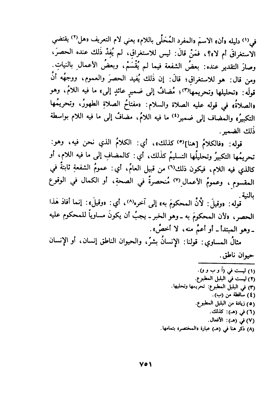 فِي دَلِيلِهِ " أَنَّ " الِاسْمَ " الْمُفْرَدَ الْمُحَلَّى بِاللَّامِ " يَعْنِي لَامَ التَّعْرِيفِ " هَلْ يَقْتَضِي الِاسْتِغْرَاقَ أَمْ لَا؟ " ; فَمَنْ قَالَ: لَيْسَ لِلِاسْتِغْرَاقِ، لَمْ يُفِدْ ذَلِكَ عِنْدَهُ الْحَصْرَ، وَصَارَ التَّقْدِيرُ عِنْدَهُ: بَعْضُ الشُّفْعَةِ فِيمَا لَمْ يُقْسَمْ، وَبَعْضُ الْأَعْمَالِ بِالنِّيَّاتِ.