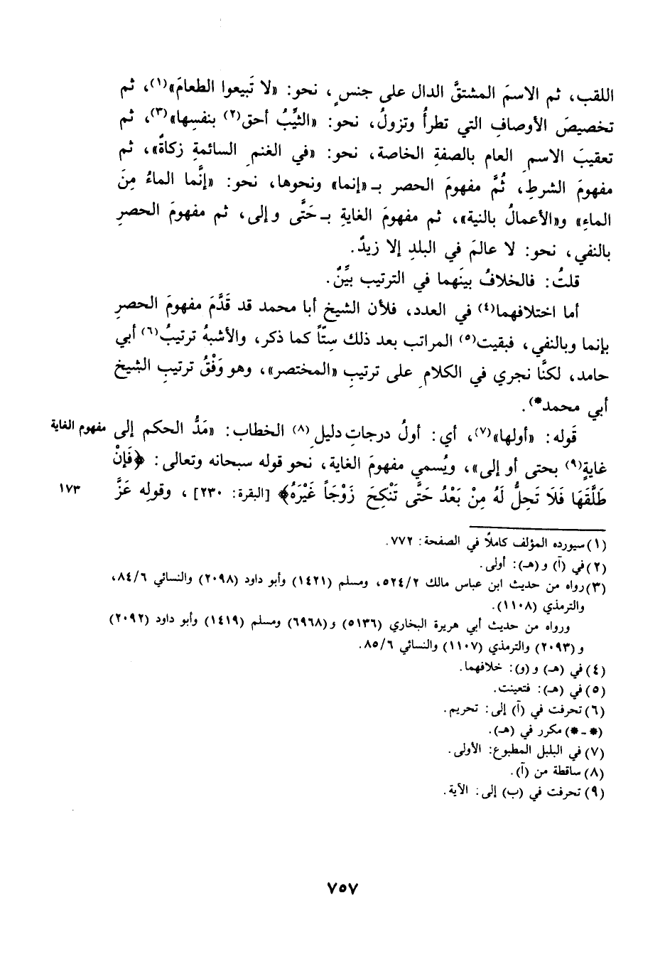 اللَّقَبِ، ثُمَّ الِاسْمَ الْمُشْتَقَّ الدَّالَّ عَلَى جِنْسٍ، نَحْوَ: لَا تَبِيعُوا الطَّعَامَ، ثُمَّ تَخْصِيصَ الْأَوْصَافِ الَّتِي تَطْرَأُ وَتَزُولُ، نَحْوَ: الثَّيِّبُ أَحَقُّ بِنَفْسِهَا، ثُمَّ تَعْقِيبَ الِاسْمِ الْعَامِّ بِالصِّفَةِ الْخَاصَّةِ، نَحْوَ: فِي الْغَنَمِ السَّائِمَةِ الزَّكَاةُ، ثُمَّ مَفْهُومَ الشَّرْطِ، ثُمَّ مَفْهُومَ الْحَصْرِ بِـ «إِنَّمَا» وَنَحْوِهَا، نَحْوَ: إِنَّمَا الْمَاءُ مِنَ الْمَاءِ، وَالْأَعْمَالُ بِالنِّيَّةِ، ثُمَّ مَفْهُومَ الْغَايَةِ بِحَتَّى، وَإِلَى، ثُمَّ مَفْهُومَ الْحَصْرِ بِالنَّفْيِ، نَحْوَ: لَا عَالِمَ فِي الْبَلَدِ إِلَّا زَيْدٌ.