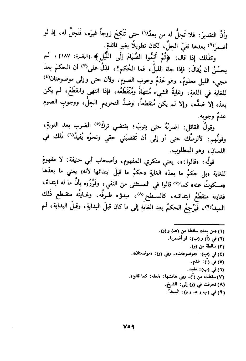 وَكَذَلِكَ إِذَا قَالَ: {ثُمَّ أَتِمُّوا الصِّيَامَ إِلَى اللَّيْلِ} [الْبَقَرَةِ: 187] ، لَمْ يَحْسُنْ أَنْ يُقَالَ: فَإِذَا جَاءَ اللَّيْلُ ; فَمَا الْحُكْمُ؟ فَدَلَّ عَلَى أَنَّ الْحُكْمَ بَعْدَ مَجِيءِ اللَّيْلِ مَعْلُومٌ، وَهُوَ عَدَمُ وُجُوبِ الصَّوْمِ، وَلِأَنَّ حَتَّى وَإِلَى مَوْضُوعَتَانِ لِلْغَايَةِ فِي اللُّغَةِ، وَغَايَةُ الشَّيْءِ مُنْتَهَاهُ وَمُنْقَطَعُهُ، فَإِذَا انْتَهَى وَانْقَطَعَ، لَمْ يَكُنْ بَعْدَهُ إِلَّا ضِدُّهُ، وَإِلَّا لَمْ يَكُنْ مُنْقَطِعًا، وَضِدُّ التَّحْرِيمِ الْحِلُّ، وَوُجُوبِ الصَّوْمِ عَدَمُ وُجُوبِهِ.