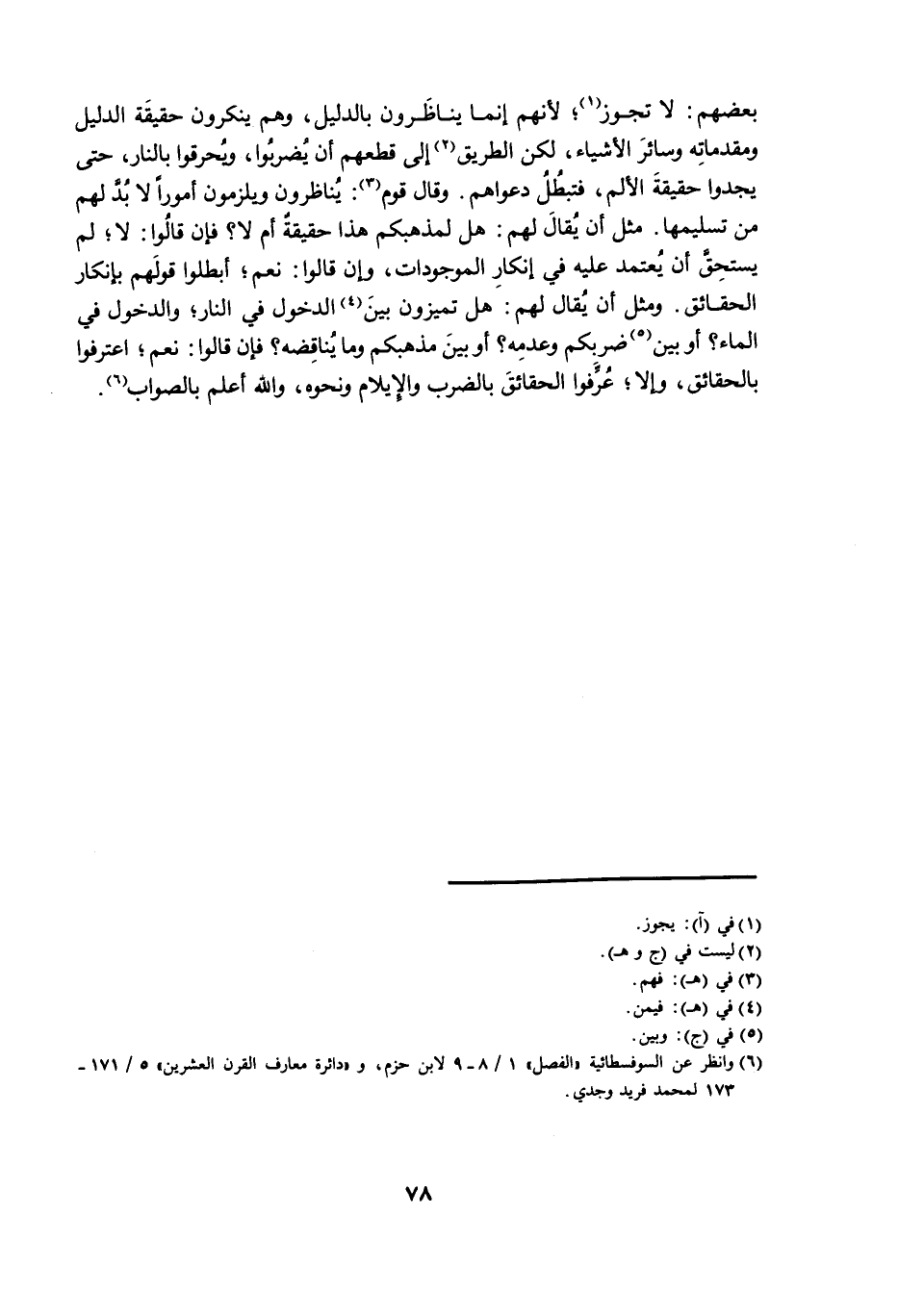 بَعْضُهُمْ: لَا تَجُوزُ ; لِأَنَّهُمْ إِنَّمَا يُنَاظِرُونَ بِالدَّلِيلِ، وَهُمْ يُنْكِرُونَ حَقِيقَةَ الدَّلِيلِ وَمُقَدَّمَاتِهِ وَسَائِرَ الْأَشْيَاءِ، لَكِنَّ الطَّرِيقَ إِلَى قَطْعِهِمْ أَنْ يُضْرَبُوا، وَيُحَرَّقُوا بِالنَّارِ، حَتَّى يَجِدُوا حَقِيقَةَ الْأَلَمِ ; فَتَبْطُلُ دَعْوَاهُمْ، وَقَالَ قَوْمٌ: يُنَاظَرُونَ وَيُلْزَمُونَ أُمُورًا لَا بُدَّ لَهُمْ مِنْ تَسْلِيمِهَا. مِثْلَ أَنْ يُقَالَ لَهُمْ: هَلْ لِمَذْهَبِكُمْ هَذَا حَقِيقَةٌ أَمْ لَا؟ فَإِنْ قَالُوا: لَا ; لَمْ يَسْتَحِقْ أَنْ يَعْتَمِدَ عَلَيْهِ فِي إِنْكَارِ الْمَوْجُودَاتِ، وَإِنْ قَالُوا: نَعَمْ، أَبْطَلُوا قَوْلَهُمْ بِإِنْكَارِ الْحَقَائِقِ، وَمِثْلَ أَنْ يُقَالَ لَهُمْ: هَلْ تُمَيِّزُونَ بَيْنَ الدُّخُولِ فِي النَّارِ، وَالدُّخُولِ فِي الْمَاءِ؟ أَوْ بَيْنَ ضَرْبِكُمْ وَعَدَمِهِ؟ أَوْ بَيْنَ مَذْهَبِكُمْ وَمَا يُنَاقِضُهُ؟ فَإِنْ قَالُوا: نَعَمْ، اعْتَرَفُوا بِالْحَقَائِقِ، وَإِلَّا عُرِّفُوا الْحَقَائِقَ بِالضَّرْبِ وَالْإِيلَامِ وَنَحْوِهِ، وَاللَّهُ أَعْلَمُ بِالصَّوَابِ.