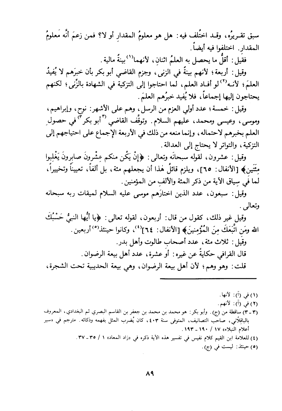 وَقِيلَ: خَمْسَةٌ ; عَدَدُ أُولِي الْعَزْمِ مِنَ الرُّسُلِ، وَهُمْ عَلَى الْأَشْهَرِ: نُوحٌ، وَإِبْرَاهِيمُ، وَمُوسَى، وَعِيسَى، وَمُحَمَّدٌ عَلَيْهِمُ السَّلَامُ. وَتَوَقَّفَ الْقَاضِي أَبُو بَكْرٍ فِي حُصُولِ الْعِلْمِ بِخَبَرِهِمْ لِاحْتِمَالِهِ، وَإِنَّمَا مَنَعَهُ مِنْ ذَلِكَ فِي الْأَرْبَعَةِ الْإِجْمَاعُ عَلَى احْتِيَاجِهِمْ إِلَى التَّزْكِيَةِ، وَالتَّوَاتُرُ لَا يَحْتَاجُ إِلَى الْعَدَالَةِ.