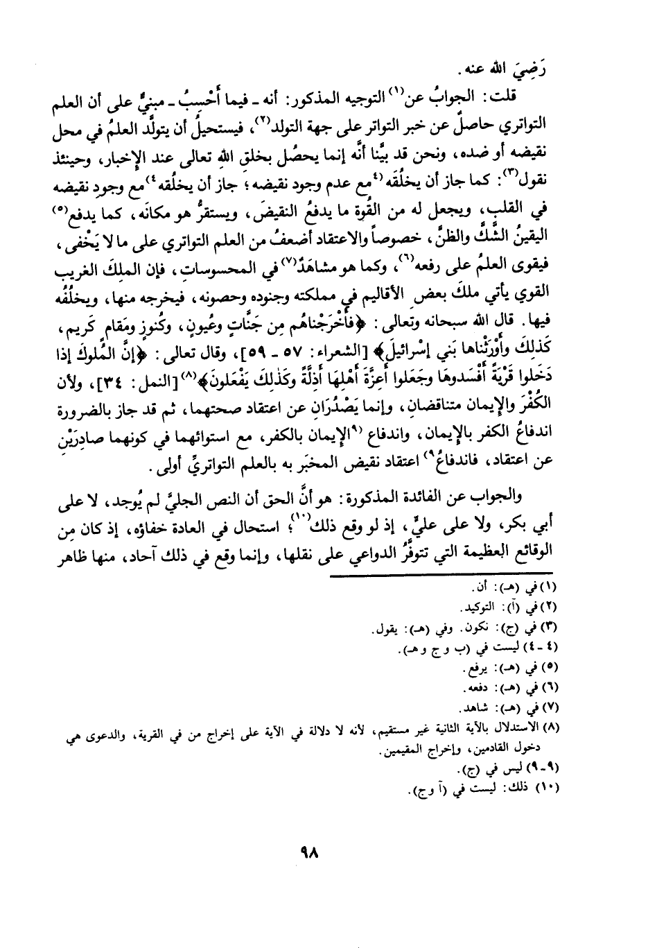 وَالْجَوَابُ عَنِ الْفَائِدَةِ الْمَذْكُورَةِ: هُوَ أَنَّ الْحَقَّ أَنَّ النَّصَّ الْجَلِيَّ لَمْ يُوجَدْ، لَا عَلَى أَبِي بَكْرٍ، وَلَا عَلَى عَلِيٍّ، إِذْ لَوْ وَقَعَ ذَلِكَ، اسْتَحَالَ فِي الْعَادَةِ خَفَاؤُهُ، إِذْ كَانَ مِنَ الْوَقَائِعِ الْعَظِيمَةِ الَّتِي تَتَوَفَّرُ الدَّوَاعِي عَلَى نَقْلِهَا، وَإِنَّمَا وَقَعَ فِي ذَلِكَ آحَادٌ، مِنْهَا ظَاهِرُ