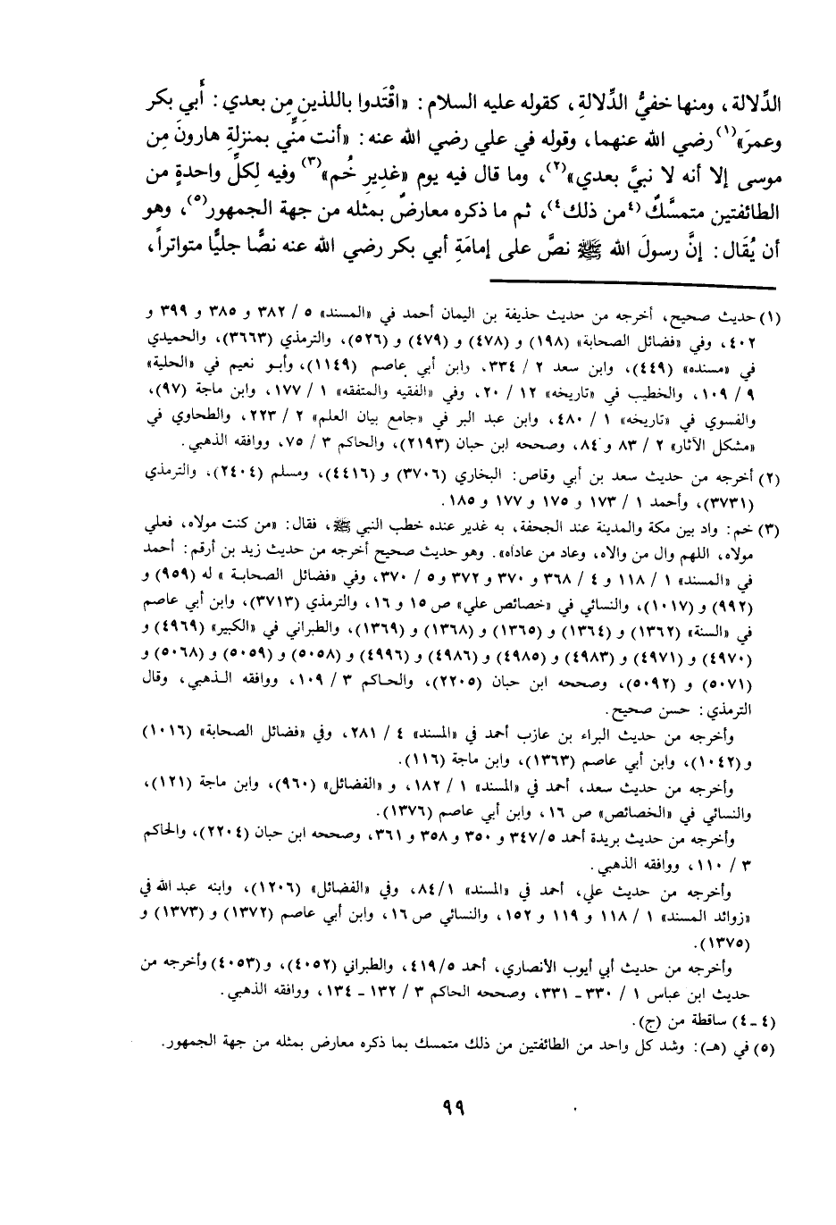 الدَّلَالَةِ، وَمِنْهَا خَفِيُّ الدَّلَالَةِ، كَقَوْلِهِ عَلَيْهِ السَّلَامُ: اقْتَدَوْا بِاللَّذَيْنِ مِنْ بَعْدِي: أَبِي بَكْرٍ وَعُمَرَ. رَضِيَ اللَّهُ عَنْهُمَا، وَقَوْلِهِ فِي عَلِيٍّ رَضِيَ اللَّهُ عَنْهُ: أَنْتَ مِنِّي بِمَنْزِلَةِ هَارُونَ مِنْ مُوسَى إِلَّا أَنَّهُ لَا نَبِيَّ بِعْدِي. وَمَا قَالَ فِيهِ يَوْمَ «غَدِيرِ خُمٍّ» وَفِيهِ لِكُلِّ وَاحِدَةٍ مِنَ الطَّائِفَتَيْنِ مُتَمَسَّكٌ مِنْ ذَلِكَ، ثُمَّ مَا ذَكَرَهُ مُعَارَضٌ بِمِثْلِهِ مِنْ جِهَةِ الْجُمْهُورِ، وَهُوَ أَنْ يُقَالَ: إِنَّ رَسُولَ اللَّهِ - صَلَّى اللَّهُ عَلَيْهِ وَسَلَّمَ - نَصَّ عَلَى إِمَامَةِ أَبِي بَكْرٍ رَضِيَ اللَّهُ عَنْهُ نَصًّا جَلِيًّا مُتَوَاتِرًا،