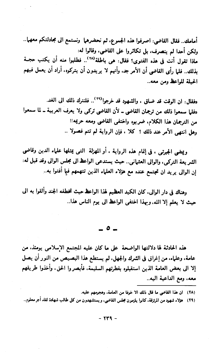 أمامك.. فقال القاضي: اصرفوا هذه الجموع، ثم نحضرهما ونستمع إلى مجادلتكم معهما.. ولكن أحدا لم ينصرف، بل تكاثروا على القاضي، وقالوا له: ماذا تقول أنت في هذه الفتوى؟ فقال: هي باطلة 1.. فطلبوا منه أن يكتب حجة بذلك. فلما رأى القاضي أن الأمر جد، وأنهم لا يريدون أن يتركوه، أراد أن يعمل فيهم الحيلة للواعظ ومن معه.. "فقال: إن الوقت قد ضاق، والشهود قد خرجوا 2. فلنترك ذلك إلى الغد. "فلما سمعوا ذلك من ترجمان القاضي - لأن القاضي تركي ولا يعرف العربية - لما سمعوا من الترجمان هذا الكلام، ضربوه واختفى القاضي ومعه حريمه!! وهل انتهى الأمر عند ذلك؟ كلا، فإن الرواية لم تتم فصولا. ويمضي الجبرتي في إتمام هذه الرواية، أو المهزلة التي يمثلها علماء الدين وقاضي الشريعة التركي، والوالي العثماني. حيث يستدعي الواعظ إلى مجلس الوالي وقد قيل له: إن الوالي يريد أن تجتمع عنده مع هؤلاء العلماء الذين تتهمهم فيما أفتوا به. وهناك في دار الوالي، كان الكيد العظيم لهذا الواعظ حيث تخطفه الجند وألقوا به إلى حيث لا يعلم إلا الله، وبهذا اختفى الواعظ إلى يوم الناس هذا.