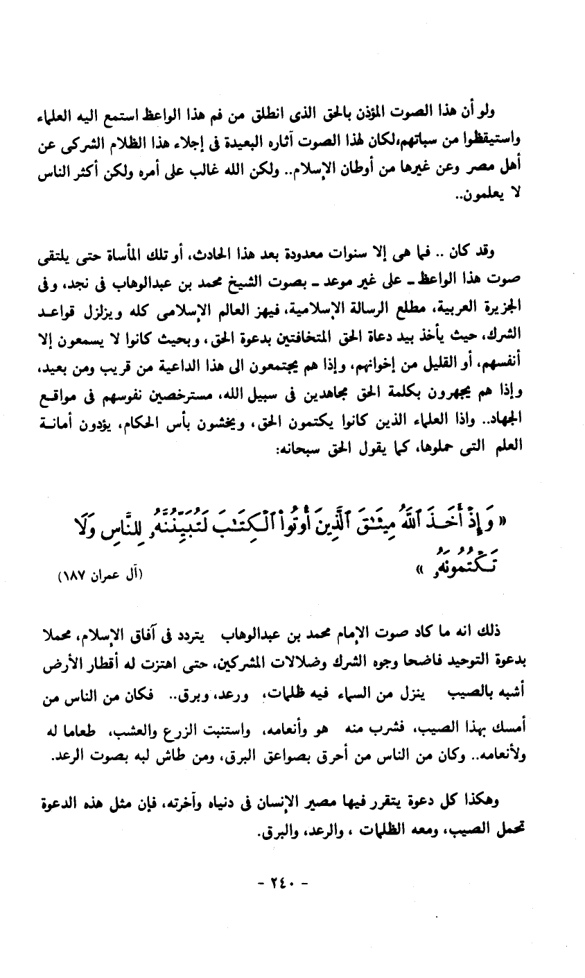 ولو أن هذا الصوت المؤذن بالحق الذي انطلق من فم هذا الواعظ استمع إليه العلماء واستيقظوا من سباتهم، لكان لهذا الصوت آثاره البعيدة في إجلاء هذا الظلام الشركي عن أهل مصر وعن غيرها من أوطان الإسلام.. ولكن الله غالب على أمره ولكن أكثر الناس لا يعلمون. وقد كان.. فما هي إلا سنوات معدودة بعد هذا الحادث، أو تلك المأساة حتى يلتقي صوت هذا الواعظ - على غير موعد - بصوت الشيخ محمد بن عبد الوهاب في نجد، وفي الجزيرة العربية مطلع الرسالة الإسلامية، فيهز العالم الإسلامي كله ويزلزل قواعد الشرك، حيث يأخذ بيد دعاة الحق المتخافتين بدعوة الحق، وبحيث كانوا لا يسمعون إلا أنفسهم، أو القليل من إخوانهم، وإذا هم يجتمعون إلى هذا الداعية من قريب ومن بعيد، وإذا هم يجهرون بكلمة الحق مجاهدين في سبيل الله، مسترخصين نفوسهم في مواقع الجهاد. وإذا العلماء الذين كانوا يكتمون الحق، ويخشون بأس الحكام يؤدون أمانة العلم التي حملوها، كما يقول الحق سبحانه: {وَإِذْ أَخَذَ اللَّهُ مِيثَاقَ الَّذِينَ أُوتُوا الْكِتَابَ لَتُبَيِّنُنَّهُ لِلنَّاسِ وَلا تَكْتُمُونَهُ} 1. ذلك أنه ما كاد صوت الإمام محمد بن عبد الوهاب يتردد في آفاق الإسلام، محملا بدعوة التوحيد فاضحا وجوه الشرك وضلالات المشركين، حتى اهتزت له أقطار الأرض أشبه بالصيب ينزل من السماء فيه ظلمات ورعد وبرق. فكان من الناس من أمسك بهذا الصيب، فشرب منه هو وأنعامه، واستنبت الزرع والعشب، طعاما له ولأنعامه.. وكان من الناس من أحرق بصواعق البرق، ومن طاش لبه بصوت الرعد. وهكذا كل دعوة يتقرر فيها مصير الإنسان في دنياه وآخرته. فإن مثل هذه الدعوة تحمل الصيب، ومعه الظلمات والرعد والبرق.