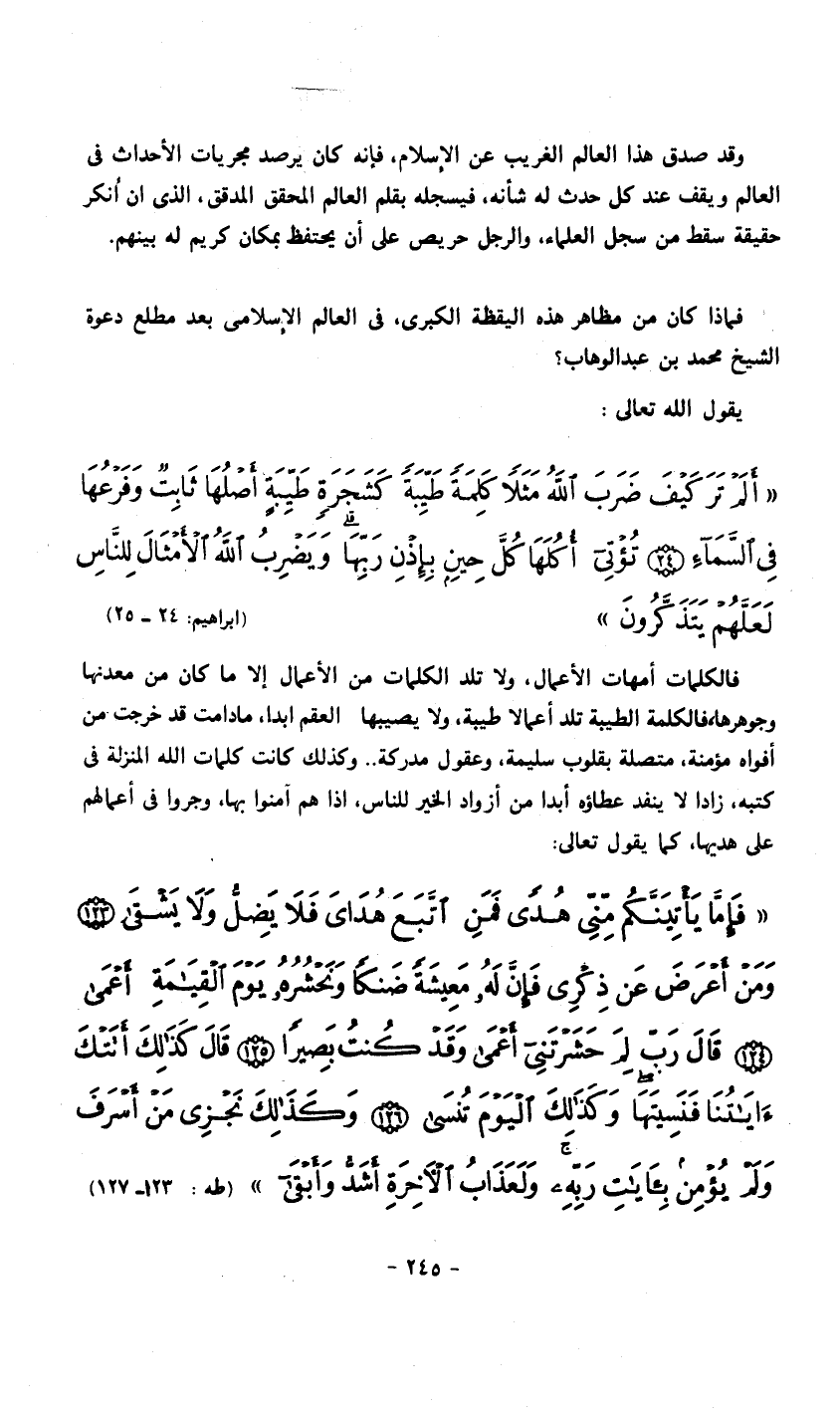 وقد صدق هذا العالم الغريب عن الإسلام؛ فإنه كان يرصد مجريات الأحداث في العالم ويقف عند كل حدث له شأنه، فيسجله بقلم العالم المحقق المدقق، الذي إن أنكر حقيقة سقط من سجل العلماء، والرجل حريص على أن يحتفظ بمكان كريم له بينهم. فماذا كان من مظاهر هذه اليقظة الكبرى في العالم الإسلامي بعد مطلع دعوة الشيخ محمد بن عبد الوهاب؟ يقول الله تعالى: {أَلَمْ تَرَ كَيْفَ ضَرَبَ اللَّهُ مَثَلاً كَلِمَةً طَيِّبَةً كَشَجَرَةٍ طَيِّبَةٍ أَصْلُهَا ثَابِتٌ وَفَرْعُهَا فِي السَّمَاءِ تُؤْتِي أُكُلَهَا كُلَّ حِينٍ بِإِذْنِ رَبِّهَا وَيَضْرِبُ اللَّهُ الأَمْثَالَ لِلنَّاسِ لَعَلَّهُمْ يَتَذَكَّرُونَ} 1.فالكلمات أمهات الأعمال، ولا تلد الكلمات من الأعمال إلا ما كان من معدنها وجوهرها، فالكلمة الطيبة تلد أعمالا طيبة، ولا يصيبها العقم أبدا، ما دامت قد خرجت من أفواه مؤمنة، متصلة بقلوب سليمة، وعقول مدركة. وكذلك كانت كلمات الله المنزلة في كتبه، زادا لا ينفد عطاؤه أبدا من أزواد الخير للناس، إذا هم آمنوا بها، وجروا في أعمالهم على هديها، كما يقول تعالى: {فَإِمَّا يَأْتِيَنَّكُمْ مِنِّي هُدىً فَمَنِ اتَّبَعَ هُدَايَ فَلا يَضِلُّ وَلا يَشْقَى وَمَنْ أَعْرَضَ عَنْ ذِكْرِي فَإِنَّ لَهُ مَعِيشَةً ضَنْكاً وَنَحْشُرُهُ يَوْمَ الْقِيَامَةِ أَعْمَى قَالَ رَبِّ لِمَ حَشَرْتَنِي أَعْمَى وَقَدْ كُنْتُ بَصِيراً قَالَ كَذَلِكَ أَتَتْكَ آيَاتُنَا فَنَسِيتَهَا وَكَذَلِكَ الْيَوْمَ تُنْسَى وَكَذَلِكَ نَجْزِي مَنْ أَسْرَفَ وَلَمْ يُؤْمِنْ بِآياتِ رَبِّهِ وَلَعَذَابُ الآخِرَةِ أَشَدُّ وَأَبْقَى} 2.
