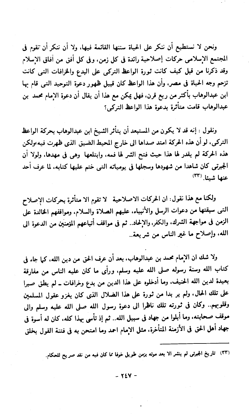 ونحن لا نستطيع أن ننكر على الحياة سننها القائمة فيها، ولا أن ننكر أن تقوم في المجتمع الإسلامي حركات إصلاحية رائدة في كل زمن، وفي كل أفق من آفاق الإسلام وقد ذكرنا من قبل كيف كانت ثورة الواعظ التركي على البدع والخرافات التي كانت تزحم وجه الحياة في مصر، وأن هذا الواعظ كان قبيل ظهور دعوة التوحيد التي قام بها ابن عبد الوهاب بأكثر من ربع قرن، فهل يمكن مع هذا أن يقال إن دعوة الإمام محمد بن عبد الوهاب قامت متأثرة بدعوة هذا الواعظ التركي؟ ونقول: إنه قد لا يكون من المستبعد أن يتأثر الشيخ ابن عبد الوهاب بحركة الواعظ التركي، لو أن هذه الحركة امتد صداها إلى خارج المحيط الضيق الذي ظهرت فيه، ولكن هذه الحركة لم يقدر لها هذا حيث فتح الشر لها فمه، وابتلعها وهي في مهدها، ولولا أن الجبرتي كان شاهدا من شهودها وسجلها في يومياته التي ختم عليها كتابه، لما عرف أحد عنها شيئا 1.ولكنا مع هذا نقول: إن الحركات الإصلاحية لا تقوم إلا متأثرة بحركات الإصلاح التي سبقتها من دعوات الرسل والأنبياء، عليهم الصلاة والسلام، ومواقفهم الخالدة على الزمن في مواجهة الشرك، والكفر، والإلحاد.. ثم في مواقف أتباعهم المؤمنين من الدعوة إلى الله، وإصلاح ما غير الناس من شريعة. ولا شك أن الإمام محمد بن عبد الوهاب، بعد أن عرف الحق من دين الله، كما جاء في كتاب الله وسنة رسوله صلى الله عليه وسلم، ورأى ما كان عليه الناس من مفارقة بعيدة لدين الله الحنيف، وما أدخلوه على هذا الدين من بدع وخرافات - لم يطق صبرا على تلك الحال، ولم ير بدا من ثورة على هذا الضلال الذي كان يغزو عقول المسلمين وقلوبهم.. وكان في ثورته تلك ناظرا إلى دعوة رسول الله صلى الله عليه وسلم وإلى موقف صحابته، وما أبلوا من جهاد في سبيل الله. ثم إذ تأسى بهذا كله، كان له أسوة في جهاد أهل الحق في الأزمنة المتأخرة، مثل الإمام أحمد وما امتحن به في فتنة القول بخلق