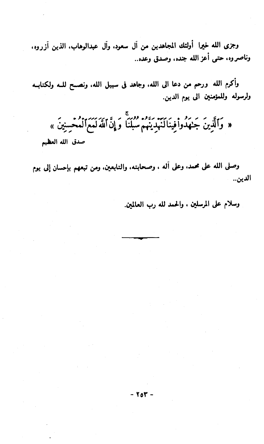 وجزى الله خيرا أولئك المجاهدين من آل سعود، وآل عبد الوهاب، الذين آزروه، وناصروه، حتى أعز الله جنده، وصدق وعده. وأكرم الله ورحم من دعا إلى الله، وجاهد في سبيل الله، ونصح لله ولكتابه ولرسوله وللمؤمنين إلى يوم الدين. {وَالَّذِينَ جَاهَدُوا فِينَا لَنَهْدِيَنَّهُمْ سُبُلَنَا وَإِنَّ اللَّهَ لَمَعَ الْمُحْسِنِينَ} صدق الله العظيم وصلى الله على محمد، وعلى آله، وصحابته، والتابعين، ومن تبعهم بإحسان إلى يوم الدين. وسلام على المرسلين، والحمد لله رب العالمين.