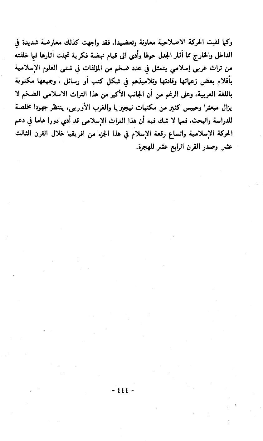 وكما لقيت الحركة الإصلاحية معاونة وتعضيدا، فقد واجهت كذلك معارضة شديدة في الداخل والخارج مما أثار الجدل حولها وأدى إلى قيام نهضة فكرية تجلت آثارها فيما خلفته من تراث عربي إسلامي يتمثل في عدد ضخم من المؤلفات في شتى العلوم الإسلامية بأقلام بعض زعمائها وقادتها وتلاميذهم في شكل كتب أو رسائل، وجميعها مكتوبة باللغة العربية، وعلى الرغم من أن الجانب الأكبر من هذا التراث الإسلامي الضخم لا يزال مبعثرا وحبيس كثير من مكتبات نيجيريا والغرب الأوربي، ينتظر جهودا مخلصة للدراسة والبحث، فمما لا شك فيه أن هذا التراث الإسلامي قد أدى دورا هاما في دعم الحركة الإسلامية واتساع رقعة الإسلام في هذا الجزء من أفريقيا خلال القرن الثالث عشر وصدر القرن الرابع عشر للهجرة.