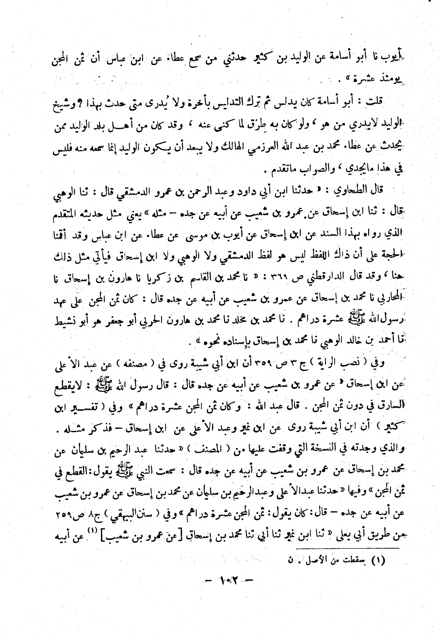 قال الطحاوي : (( حدثنا أبن أبي داود وعبد الرحمن بن عمرو الدمشقي قال ثنا الوهبي قال : ثنا ابن إسحاق عن عمرو بن شعيب عن أبيه عن جده -مثله )) يعنى مثل حديثه المتقدم الذي رواه بهذا السند عن ابن إسحاق عن أيوب بن موسى عن عطاء عن ابن عباس وقد أقمنا الحجة على ذاك اللفظ ليس هو لفظ الدمشقي ولا الوهبي ولا ابن إسحاق فيأتي مثل ذلك هنا ، وقد قال الدارقطني ص369 : (( نا محمد بن القاسم بن زكريا نا هارون بن إسحاق نا المحأبي نا محمد بن إسحاق عن عمرو بن شعيب عن أبيه عن جده قال : كان ثمن المجن على عهد رسول الله - صلى الله عليه وسلم - عشرة دراهم . نا محمد بن مخلد نا محمد بن هارون الحربي أبو جعفر هو أبو نشيط نا أحمد بن خالد الوهبي نا محمد بن إسحاق بإسناده نحو )) .