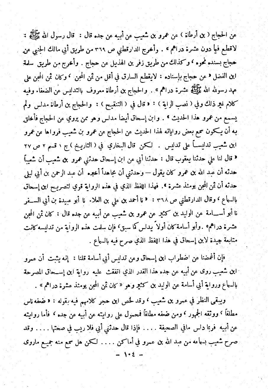 عن الحجاج ( بن أرطاة ) عن عمرو بن شعيب عنأبيه عن جده قال : قال رسول الله - صلى الله عليه وسلم - : لا قطع فيما دزن عشرة دراهم )) . وأخرج الدارقطني ص 369 من طريق أبي مالك الجني عن حجاج بسنده بإسناده : لا يقطع السارق في أقل من ثمن المجن ، وكان ثمن المجن على عهد رسول الله - صلى الله عليه وسلم - عشرة دراهم )) والحجاج بن أرطاة معروف بالتدليس عن الضعفاء وفيه كلام غير ذلك وفي ( نصب الراية ) : (( قال في (التنقيح) : والحجاج بن أرطاة مدلس ولم يسمع من عمرو هذا الحديث )). وابن إسحاق أيضاً مدلس وهو ممن يروي عن الحجاج فأخلق به أن يكون سمع بعض رواياته لهذا الحديث عن الحجاج عن عمرو بن شعيب فرواها عن عمرو ابن شعيب تدليساً عل تدليس. لكن قال البخاري في ( التاريخ ) ج1 قسم 2 ص27 (( قال لنا على حدثنا يعقوب قال : حدثنا أبي عن أبن إسحاق حدثني عمرو بن شعيب أن شعيباً حدثه أن عبد