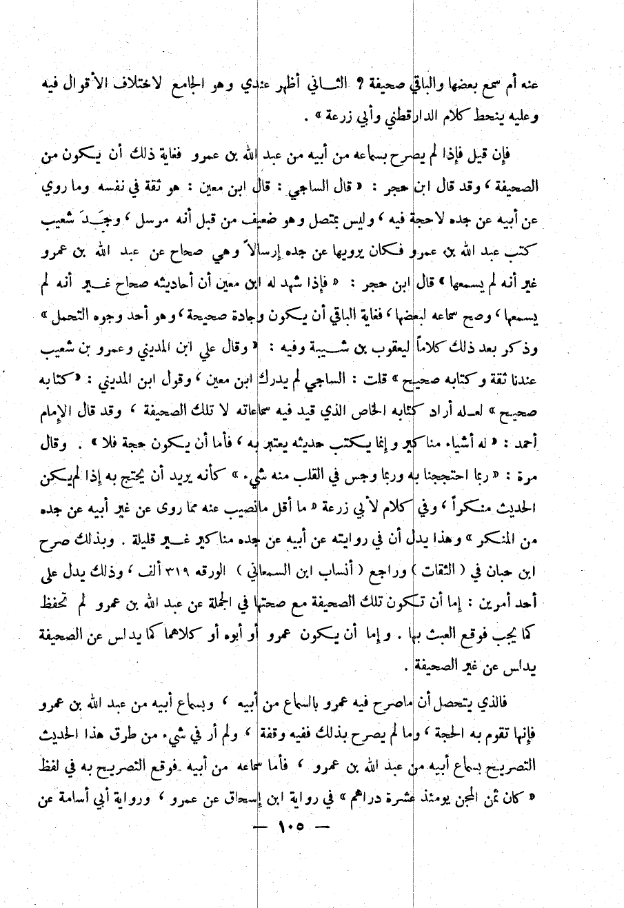 فإن قيل فإذا لم يصرح بسماعه من أبيه من عبد الله بن عمرو فغاية ذلك ان يكون من الصحيفة ، وقد قال ابن حجر : (( قال الساجي : قال ابن معين : هو ثقة في نفسه وما روي عن أبيه عن جده لا حجة فيه ، وليس بمتصل وهو ضعيف من قبل انه مرسل ، وجد شعيب كتب عبد الله بن أبي عمرو فكان يرويها عم جده إرسالاً وهي صحاح عن عبد الله بن عمرو غير أنه لم يسمعها )) قال ابن حجر : (( فإذا شهد له ابن معين ان أحاديثه صحاح غير أنه لم يسمعها ، وصح سماعه لبعضها ، فغاية الباقي ان يكون وجادة صحيحة ، وهو أحد وجوه التحمل )) وذكر بعد ذلك كلاماً ليعقوب بن شيبة وفيه : (( وقال علي ابن المديني وعمرو بن شعيب عندنا ثقة وكتابة صحيح )) قلت : الساجي لم يدرك ابن معين ، وقول ابن المديني : (( كتابه صحيح )) لعله أراد كتابه الخاص الذي قيد فيه سماعاته لا تلك الصحيفة ، وقد قال الامام أحمد : (( له أشياء مناكير وإنما يكتب حديثه يعتبر به ، فأما أن يكون حجة فلا )) . وقال مرة : (( ربما احججنا به وربما وجس في القلب منه شئ )) مأنه يريد أن يحتج به إذا لم يكن الحديث منكراً ، وفي كلام أبي زرعة (( ما أقل ما نصيب عنه مما روى عن غير أبيه عن جده من المنكر )) وهذا يدل أن في روايته عن أبيه عن جده مناكير غير قليلة . وبذلك صرح ابن حبان في ( الثقات ) وراجع ( أنساب ابن السمعاني ) الورقة 319 الف ، وذلك يدل على أحد أمرين : إما أن تكون تلك الصحيفة مع صحتها في الجملة عن عبد الله بن عمرو لم تحفظ كما يجب فوقع العبث بها . وإما أن يكون عمرو أو أبوه او كلاهما كما يدلس عن الصحيفة يدلس عن فير الصحيفة .