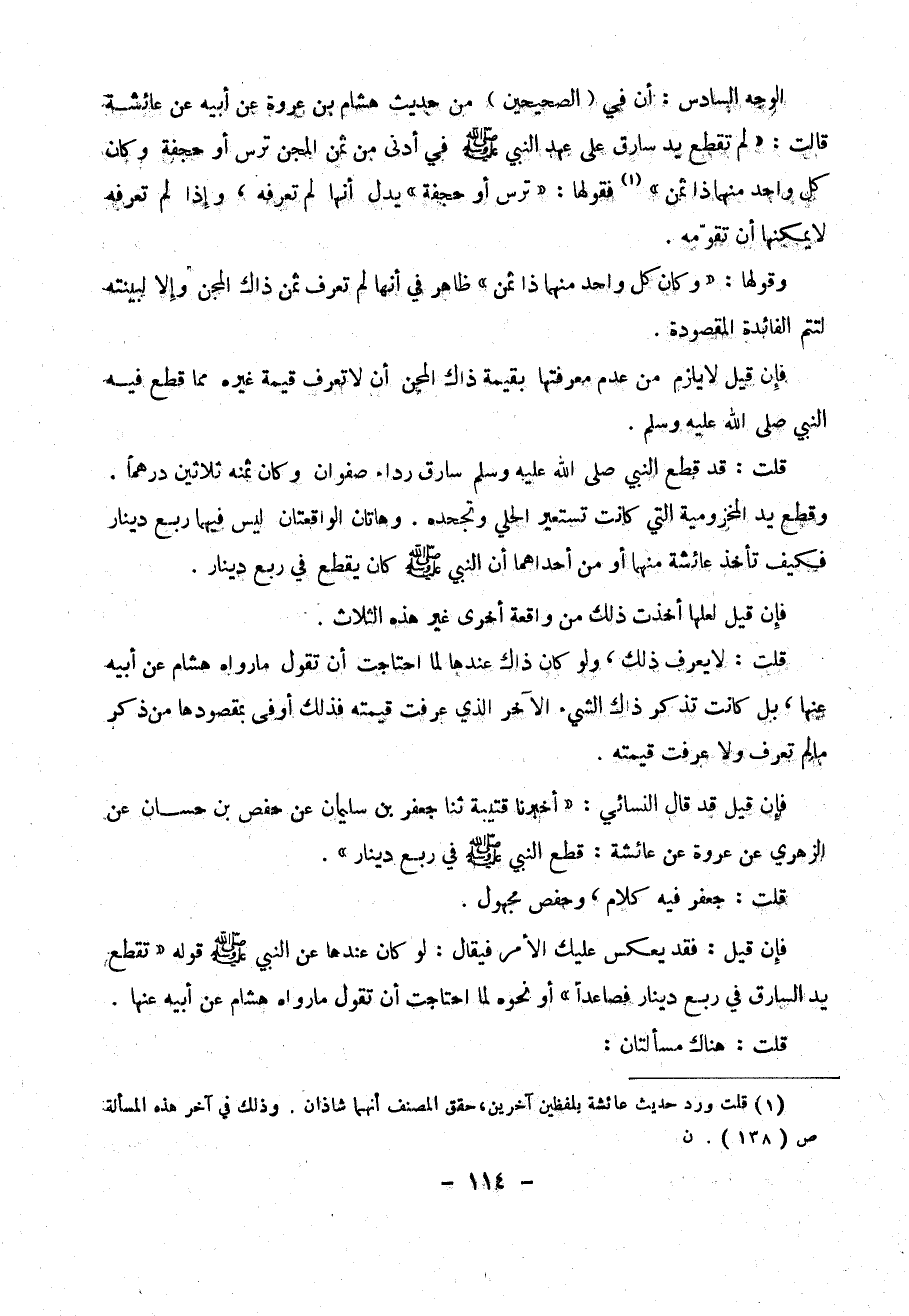 قلت : قد قطع النبي صلى الله عليه وسلم سارق رداء صفوان وكان ثمنه ثلاثين درهماً، وقطع يد المخزومية التي كانت تستعير الحلي وتجحده . وهاتان الواقعتان ليس فيها ربع دينار فكيف تأخذ عائشة منها او من احدهما ان النبي صلى الله عليه وسلم كان يقطع في ربع دينار .