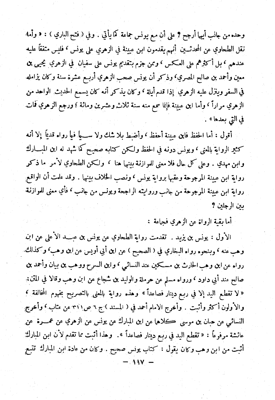 وحده من جانب أيهما أرجح ؟ على أن مع يونس جماعة كما يأتي . وفي ( فتح الباري ) : (( وأما نقل الطحاوي عن المحدثين أنهم يقدمون ابن عيينة في الزهري على يونس ، فليس متفقاً عليه عندهم ، بل أكثرهم على العكس ، وممن جزم بتقديم يونس على سفيان في الزهري يحيى بن معين وأحمد بن صالح المصري ، وذكر أن يونس صحب الزهري أربع عشرة سنة وكان يزامله في السفر وينزل عليه الزهري إذا قدم أيلة ،و كان يذكر أنه كان يسمع الحديث الواحد من الزهري مراراً ، وأما ابن عيينة فإنما سمع منه سنة ثلاثة وعشرون ومائة ، ورجع الزهري فمات في التي بعدها )) .
