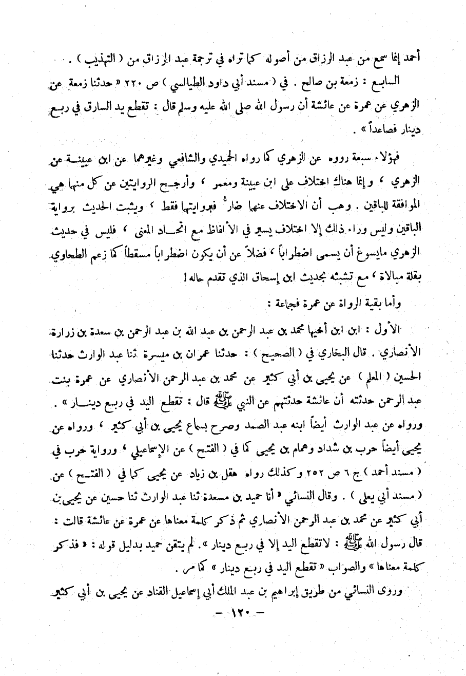 ورواه عن عبد الوارث أيضاً أبنه عبد الصمد وصرح بسماع يحيى بن أبي كثير ، ورواه عن يحيى أيضاً حرب بن شداد وهمام بن يحيى كما في ( الفتح ) عن الأسماعيلي ، ورواية حرب في ( مسند أحمد ) ج 6 ص 252 وكذلك رواه هقل بن زياد عن يحيى كما في ( الفتح ) عن ( مسند أبي يعلى ) . وقال النسائي (( أنا حميد بن مسعدة ثنا عبد الوارث ثنا حسين يحيى بن أبي كثير عن محمد بن عبد الرحمن الأنصاري ثن ذكر كلمة معناها عن عمرة عن عائشة قالت : قال رسول الله - صلى الله عليه وسلم - : لا تقطع اليد إلا في ربع دينار)). لم يتقن حميد بدليل قوله : فذكر كلمة معناها )) والصواب (( تقطع اليد في ربع دينار )) كما مر .
