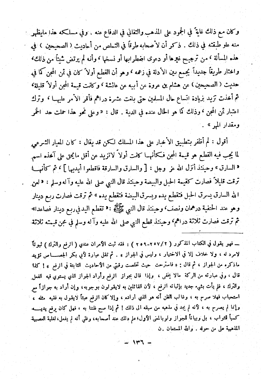 وكان مع ذلك غاية في الجمود على المذهب والتفاني في الدفاع عنه . وفي مسلكه هذا ما يظهر منه علو طبقته في ذلك . ذكر أن لأصحابه طرقاً في التملص من أحاديث ( الصحيحين ) في هذهالمسألة ، من ترجيح غيرها أو دعوى اضطرابها أو نسخها، وأنه لم يرتض شيئاً من ذلك ، واختار طريقاً جديداً يجمع بين الادلة في زعمه ، وهو أولاً كان في ثمن المجن كما في حديث ( الصحيحين ) عن هشام بن عروة عن أبيه عن عائشة ، وكانت قيمة المجن أولاً قليلة ، ثم أخذت تزيد بزيادة أتساع حال المسلمين حتى بلغت عشرة دراهم فأقر الأمر عليها ، وترك اعتبار ثمن المجن ، وذلك كما هو الحال عنده في الدية . قال : (( وعلى نحو هذا حملت حد الخمر ومقدار المهر )) .