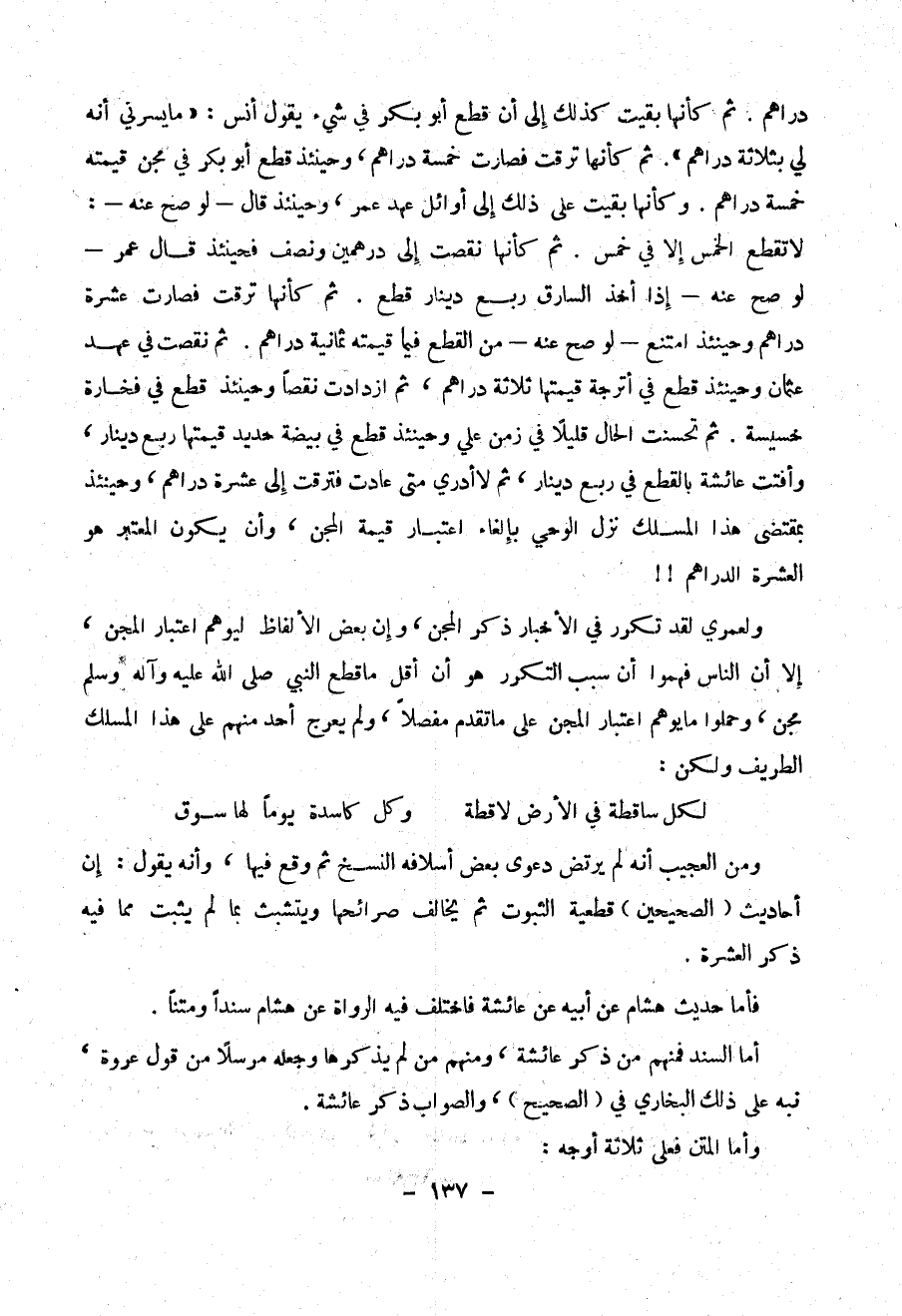 ثم كأنها بقيت كذلك إلى أن قطع أبو بكر في شئ يقول أنس : (( ما يسرني أنه لي بثلاثة دراهم )) . ثم كأنها ترقت فصارت خمسة دراهم ، وحينئذ قطع أبو بكر في مجن قيمته خمسة دراهم . وكأنها بقيت على ذلك إلى عهد عمر ، وحينئذ قال – لو صح عنه - : لا تقطع الخمس إلا في خمس . ثم كأنها نقصت إلى درهمين ونصف فحينئذ قال عمر – لو صح عنه – إذا أخذ السارق ربع دينار قطع . ثم كأنها ترقت فصارت عشرة دراهم وحينئذ امتنع – لو صح عنه – من القطع في ما قيمته ثمانية دراهم . ثم نقصت في عهد عثمان وحينئذ قطع في أترجة قيمتها ثلاثة دراهم ، ثم ازدادت نقصاً وحينئذ قطع في فخارة خسيسة . ثم تحسنت الحال قليلاً في زمن علي وحينئذ قطع في بيضة حديد قيمتها ربع دينار ، وأفتت عائشة بالقطع في ربع دينار ، ثم لا ادري متى عادت فترقت إلى عشرة دراهم ، وحينئذ بمقتضى هذا المسلك نزل الوحي وبإلغاء اعتبار قيمة المجن ، وأن يكون هو العشرة الدراهم !!