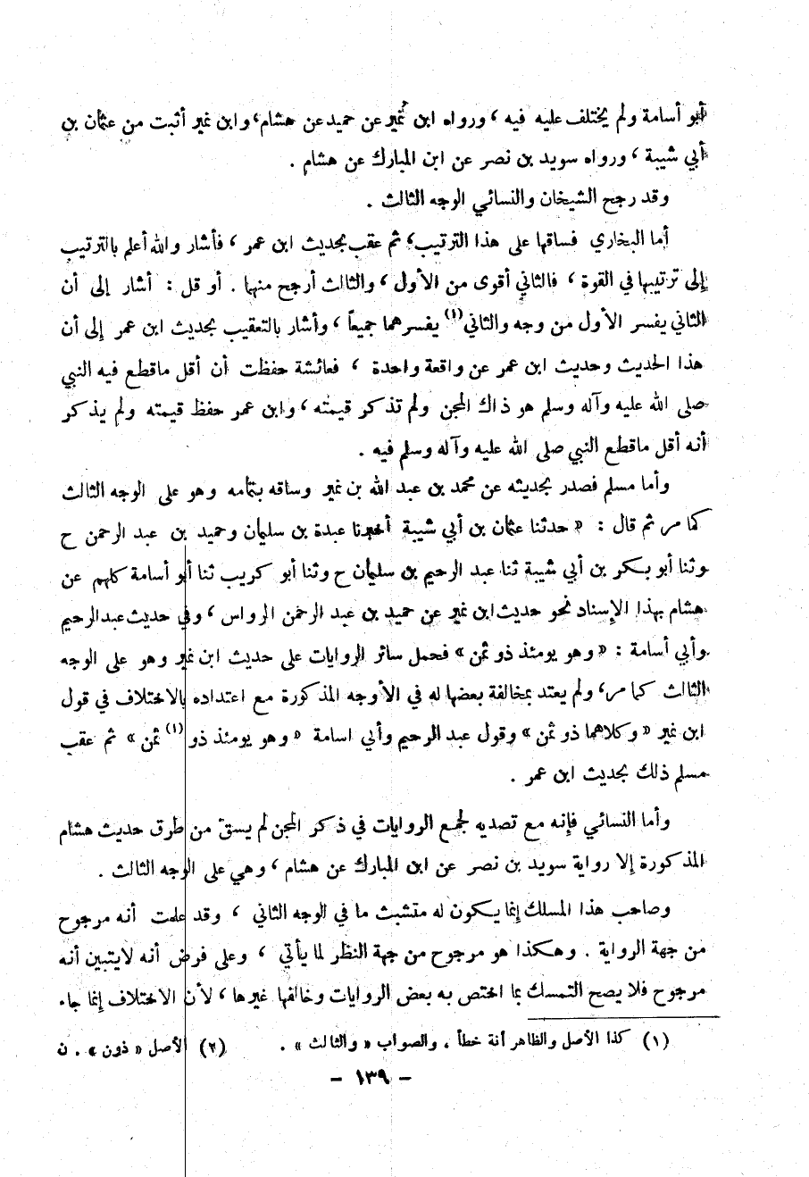و أما مسلم فصدر بحديثه عن محمد بن عبد الله بنمير وساقه بتمامه وهو على الوجه الثالث كما مر ثم قال : (( حدثنا عثمان بن أبي شيبة أخبرنا عبدة بن سليمان وحميد بن عبد الرحمن ح وثنا أبو بكر بن أبي شيبة ثنا عبد الرحيم بن سليمان ح وثنا أبو كريب ثنا أبو أسامة كلهم عن هشام بهذا الإسناد نحو حديث ابن نمير عن حميد بن عبد الرحمن الرواس ، وفي حديث عبد الرحيم وأبي أسامة : (( وهو يومئذ ذو ثمن )) فحمل سائر الروايات على حديث ابن نمير وهو على الوجه الثالث كما مر ، ولم يعتد بمخالفة بعضها له في الأوجه المذكورة مع اعتداده بالإختلاف في قول ابن نمير (( وكلاهما ذو ثمن)) وقول عبد الرحيم وأبو أسامة : (( وهو يومئذ ذو (2) ثمن )) ثم عقب مسلم ذلك بحديث ابن عمر .
