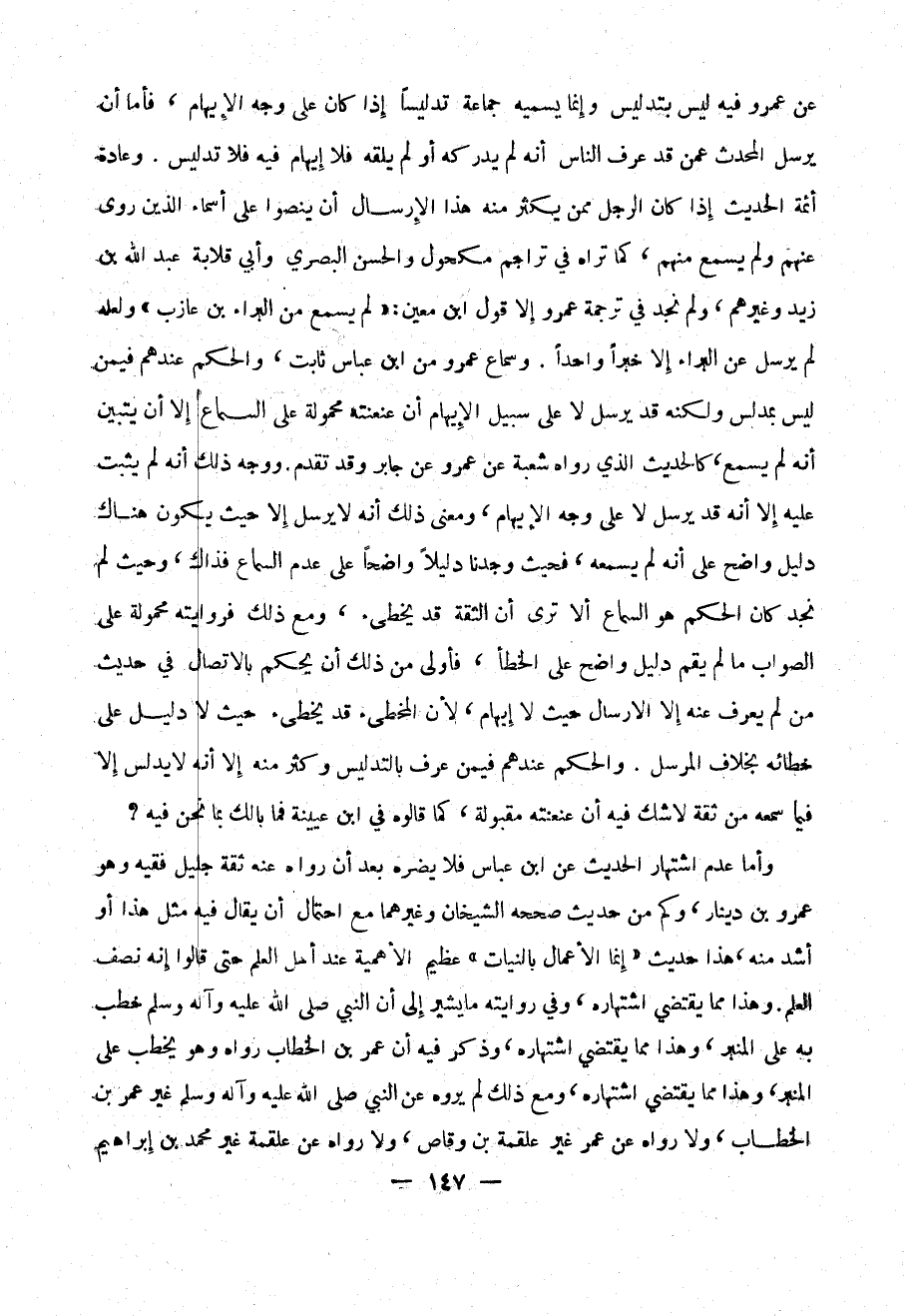 عن عمرو فيه ليس بتدليس وإنما يسميه جماعة تدليساً إذا كان على وجه الإيهام ، فأما أن يرسل المحدث عمن قد عرف الناس أنه لم يدركه أو لم يلقه فلا إيهام فيه فلا تدليس . وعادة أئمة الحديث إذا كان الرجل ممن يكثر منه هذا الإرسال أن ينصوا على أسماء الذين روى عنهم ولم يسمع منهم ، كما تراه في تراجم مكحول والحسن البصري وأبي قلابة عبد الله بن زيد وغيرهم ، ولم نجد في ترجمة عمرو إلا قول ابن معين : (( لم يسمع في البراء بن عازب )) ولعله لم يرسل عن البراء إلا خبراً واحداً . وسماع عمرو من ابن عباس ثابت ، والحكم عندهم فيمن ليس بمدلس ولكنه قد يرسل لا على سبيل الإيهام أن عنعنته محمولة علة السماع إلا أن يتبين أنه لم يسمع ، كالحديث الذي رواه شعبة عن عمرو عن جابر وقد تقدم . ووجه ذلك أنه لم يثبت عليه إلا أنه قد يرسل لا على وجه الإيهام ، ومعنى ذلكأنه لا يرسل إلا حيث يكون هناك دليل واضح على أنه لم يسمعه ، فحيث وجدنا دليلاً واضحاً على عدم السماع فذاك ، وحيث لم نجد كان الحكم هو السماع ألا ترى أن الثقة قد يخطئ ، ومع ذلك فروايته محمولة على الصواب ما لم يقم دليل واضح على الخطأ ، فأولى من ذلك أن يحكم بالاتصال في حديث من لم يعرف عنه ألا الإرسال حيث لا إيهام ، لأن المخطئ قد يخطئ حيث لا دليل على خطائه بخلاف المرسل . والحكم عندهم فيمن عرف بالتدليس وكثر منه إلا أنه لا يدلس إلا فيما سمعه من ثقة لا شك فيه أن عنعنته مقبولة ، كما قالوه في ابن عيينة فما بالك بما نحن فيه ؟