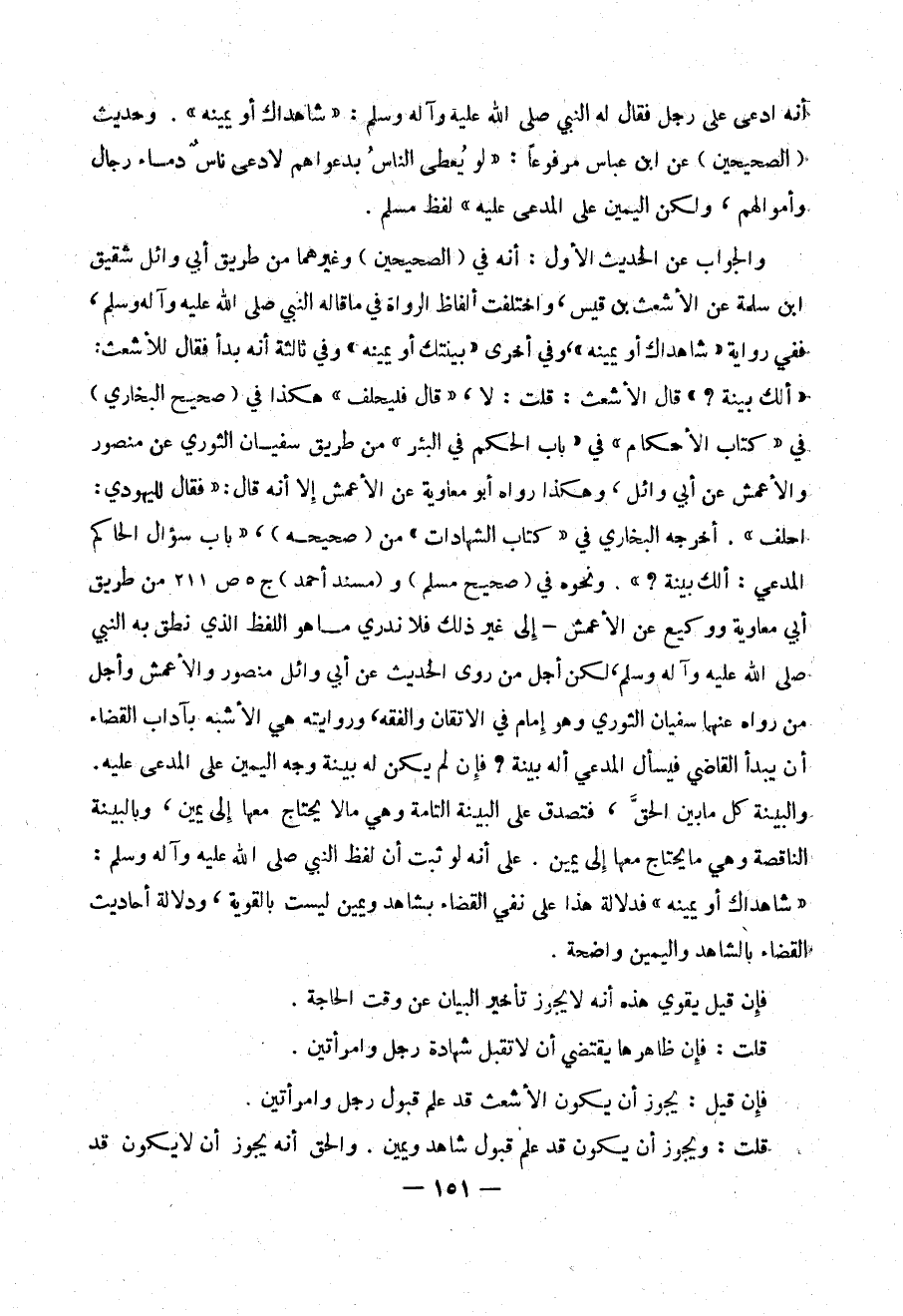 والجواب على الحديث الاول : أنه في ( الصحيحين ) وغيرهما من طريق أبي وائل شقيق ابن سلمة عن الاشعث بن قيس ، وأختلفت ألفاظ الرواة في مقاله النبي صلى الله عليه وآله وسلم ، ففي رواية (( شاهداك أو يمينه )) ، وفي أخرى (( بينتك أو يمينه )) وفي ثالثة أنه بدأ فقال للأشعث : ألك بينة ؟ )) قال الأشعث : قلت : لا ، (( قال فيحلف )) هكذا في ( صحيح البخاري ) في (( كتاب الأحكام )) في (( باب الحكم في البشر )) من طريق سفيان الثوري عن منصور والأعمش عن أبي وائل ،و هكذا رواه أبو معاوية عن الأعمش إلا أنه قال : (( فقال لليهودي : احلف )) . أخرجه البخاري في (( كتاب الشهادات )) من ( صحيحيه ) ، باب سؤال الحاكم المدعي : ألك بينة ؟ )) . ونحوه في ( صحيح مسلم ) و( مسند أحمد ) ج 5 ص 211 من طريق أبي معاوية ووكيع عن الأعمش – إلى غير ذلك فلا ندري ما هو اللفظ الذي نطق به النبي صلى الله عليه وآله وسلم ، ولكن أجل من روى الحديث عن أبي منصور والأعمش وأجل من رواه عنهما سفيان الثوري وهو إمام الاتقان والفقه ، وروايته هي الأشبه بآداب القضاء أن يبدأ فيسأل المدعي أله بينة ؟ فإن لم يكن له بينة وجه اليمين على المدعى عليه . والبينة كل ما بين الحق ، فتصدق على البينة التامة وهي ما لا يحتاج معها الى يمين ، وبالبينة الناقصة وهي ما يحتاج معها الى يمين . على انه لو ثبت ان لفظ النبي صلى الله عليه وآله وسلم:(( شاهداك أو يمينه )) فدلالة هذا على نفي القضاء بشاهد ويمين ليست بالقوة ، ودلالة أحاديث القضاء بالشاهد واليمين واضحة .