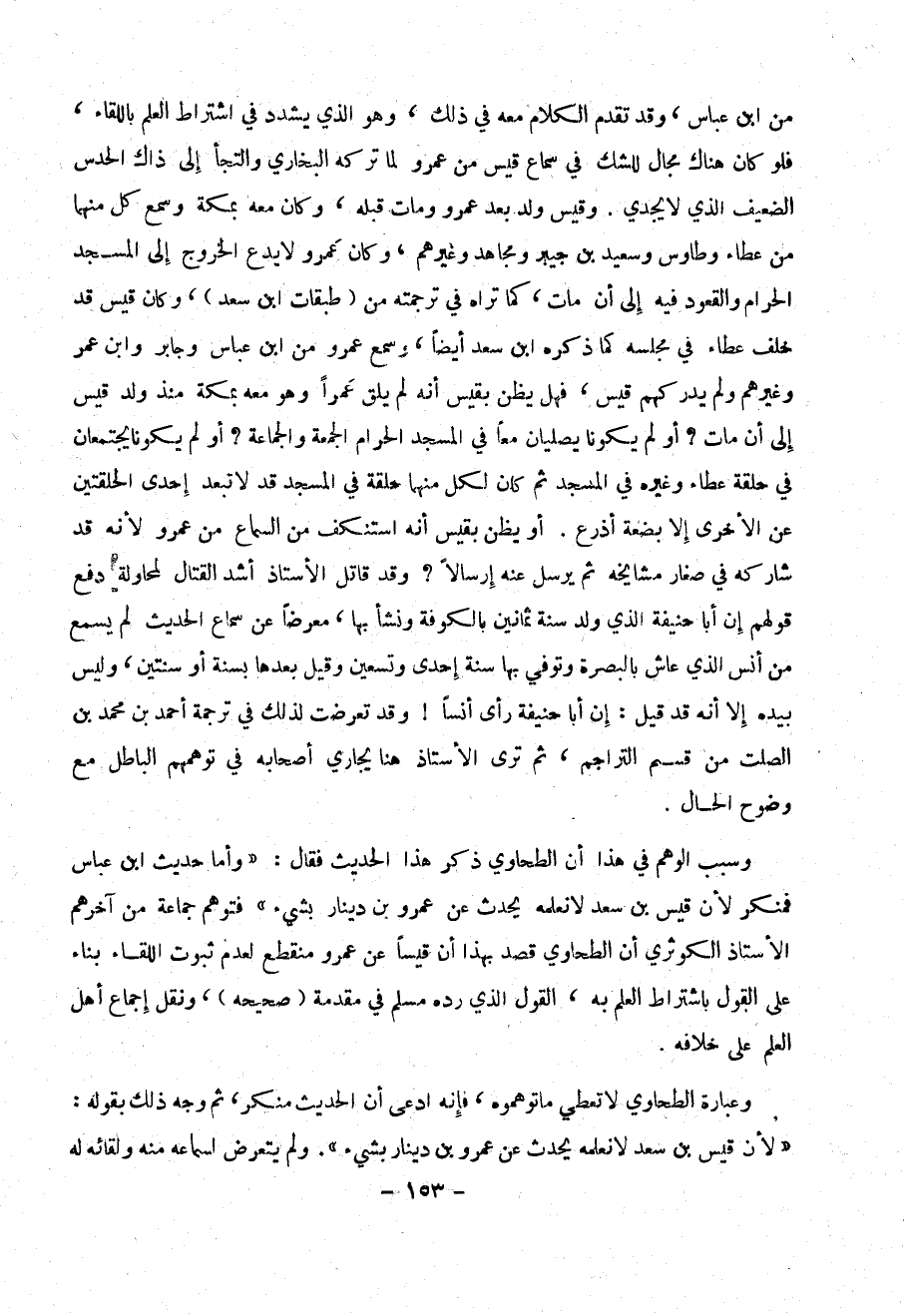 من ابن عباس ، وقد تقدم الكلام معه في ذلك ،وهو الذي يشدد في اشتراط العلم باللقاء ، فلو كان هناك مجال للشك في سماع قيس من عمرو لما تركه البخاري والتجأ إلي ذاك الحدس الضعيف الذي لا يجدي ، وقيس ولد بعد عمرو ومات قبله ، وكان معه في مكة وسمع كل منهما من عطاء وطاوس وسعد بن جبير ومجاهد وغيرهم ،وكان عمرو لا يدع الخروج الى المسجد الحرام والقعود فيه إلي أن مات ،كما تراه في ترجمة من(طبقات ابن سعد ) ، وكان قيس قد خلف عطاء في مجلسه كما ذكره ابن سعد أيضا ، وسمع عمرو من ابن عباس وجابر وابن عمر وغيرهم ولم يدركهم قيس ، فهل يظن بقيس انه لم يلق عمرا وهوه معه بمكة منذ ولد قيس إلى أن مات ؟ أو لم يكونا يصليان في المسجد الحرام الجمعة والجماعة ؟ أو لم يكونا يجتمعان في حلقة عطاء غيره في المسجد ثم كان لكل منهما حلقة في المسجد قد لا تبعد إحدى الحلقتين عن الأخرى إلا بضعة اذرع. او يظن بقيس انه استنكف السماع من عمرو لأنه قد شاركه في صغار مشايخه ثم يرسل عنه إرسالا ؟ وقد قاتل الأستاذ اشد القتال لمحاولة دفع قولهم أن أبا حنيفة الذي ولد سنة ثمانين بالكوفة ونشأ بها ، معرضا عن سماع الحديث لم يسمع من انس الذي عاش بالبصرة وتوفي بها سنة إحدى وتسعين وقيل بعدها بسنه او سنتين ، وليس بيده إلا انه قد قيل : أن أبا حنيفة رأى أنسا ! وقد تعرضت لذلك في ترجمة احمد بن محمد بن الصلت من قسم التراجم ، ثم ترى الأستاذ هنا يجاري أصحابه في توهمهم الباطل مع وضوح الحال .