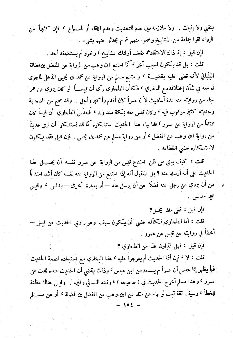قلت : بل قد يكون لسبب آخر ، كما امتنع ابن وهب من الرواية عن المفضل بن فضالة القتباني لأن قضى عليه بقضية ، وامتنع مسلم عن الرواية عن محمد بن يحيى الذهلي لما جرى له معه في شأن اختلافه مع البخاري فكأن الطحاوي رأى أن قيس لو كان يروي عن عمر لجاء من روايته عنه عدة أحاديث لأن عمراً كان أقدم وأكبر وأجل . وقد سمع من الصحابة وحديثه كثير مرغوب فيه ، وكان قيس معه بمكة منذ ولد ، فحدس الطحاوي أن قيساً كان ممتنعاً من الرواية عن عمرو ، فلما جاء هذا الحديث استنكره كما قد نستنكر أن نرى حديثاً من رواية ابن وهب عن المفضل ، أو من رواية مسلم عن محمد بن يحيى . فإن قيل فقد يكون لإستنكاره خشي إنقطاعه .