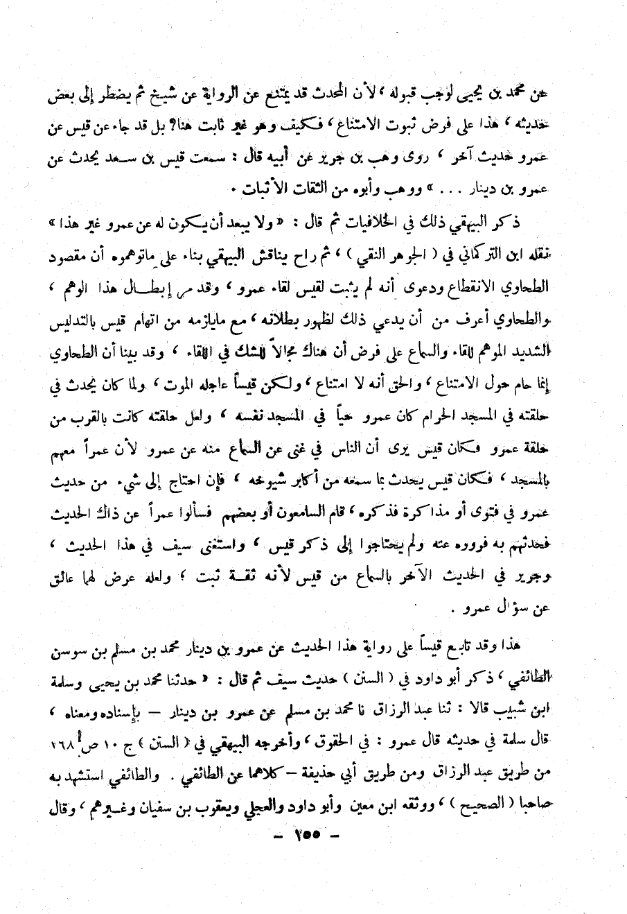 عن محمد بن يحيى لوجب قبوله ، لأن المحدث قد يمتنع عن الرواية عن شيخ ثم يضطر إلى بعض حديثه ، هذا على فرض ثبوت الامتناع ، فكيف وهو غير ثابت هنا ؟ بل قد جاء عن قيس عن عمرو حديث آخر ، روى وهب بن جرير عن أبيه قال : سمعت قيس بن سعد يحدث عن عمرو بن دينار ... )) ووهب وأبوه من الثقات الأثبات .
