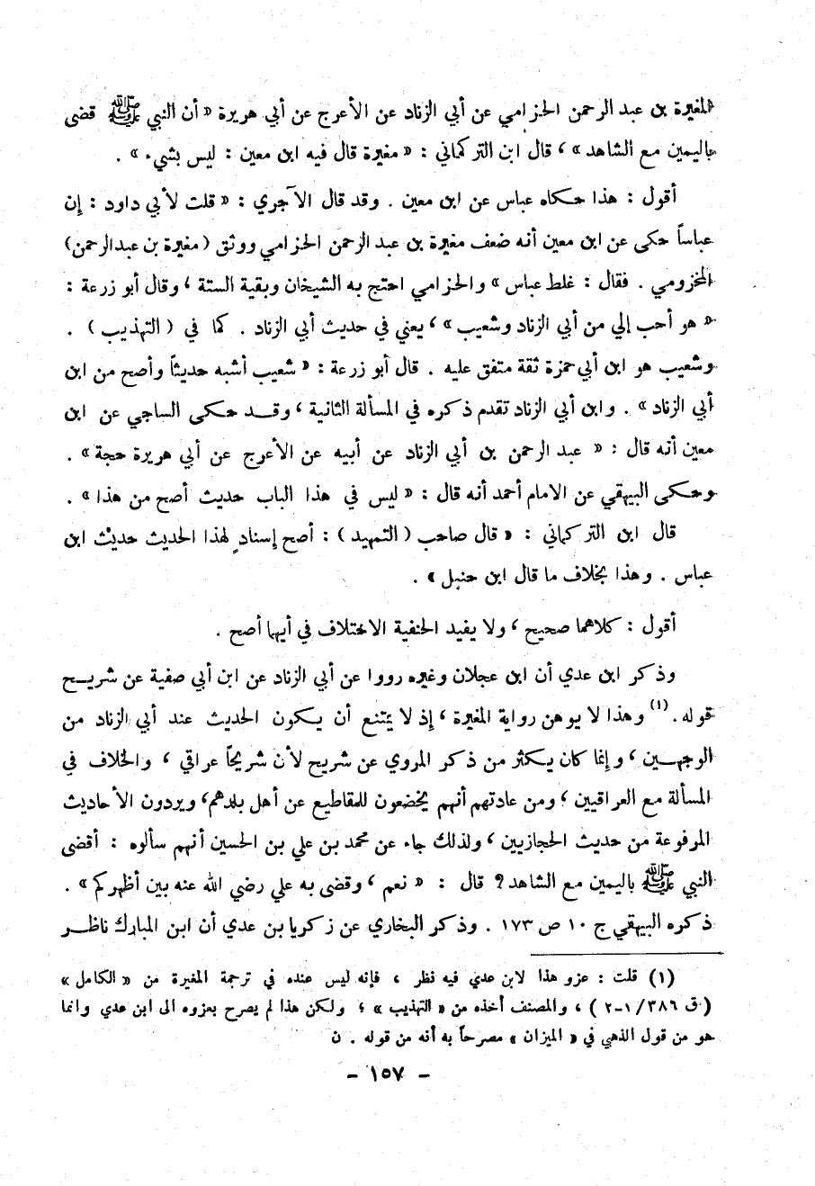 وذكر ابن عدي أن ابن عجلان وغيره رووا عن أبي الزناد عن ابن أبي صفية عن شريح قوله. (1) وهذا لا يوهن رواية المغيرة، إذا لا يمتنع أن يكون الحديث عن أبي الزناد من الوجهين، وإنما كانم يكثر من ذكر المروي عن شريح لأن شريحاً عراقي، والخلاف في المسألة مع العراقيين، ومن عادتهم أنهم يخضعون للمقاطيع عن أهل بلدهم، ويردون الأحاديث المرفوعة من حديث الحجازين، ولذلك جاء عن محمد بن علي بن الحسين أنهم سألوه: أقضى النبي - صلى الله عليه وسلم - باليمين مع الشاهد؟ قال: ((نعم، وقضى به علي رضي الله عنه بين اظهركم)). ذكره البيهقي ج 10 ص 173. وذكر البخاري عن زكريا بن عدي أن ابن المبارك ناظر
