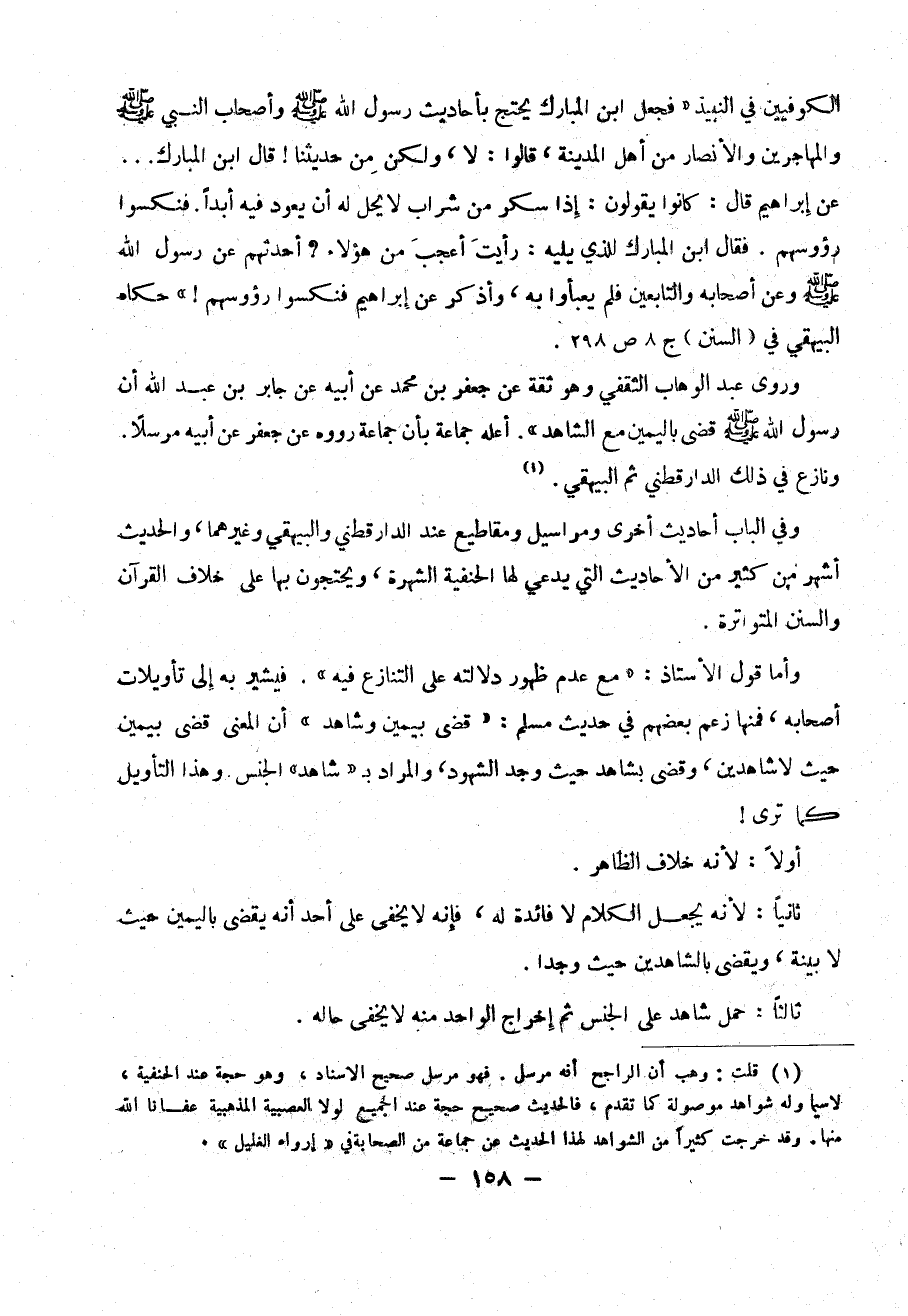 وأما قول الأستاذ : (( مع عدم ظهور دلالته على التنازع فيه )) . فيشير به إلى تأويلات أصحابه ، فمنها زعم بعضهم في حديث مسلم : (( قضى بيمين وشاهد )) أن المعنى قضى بيمين حيث لا شاهدين ، وقضى بشاهد حيث وجد الشهود ، والمراد ب ( شاهد ) الجنس وهذا التأويل كما ترى !