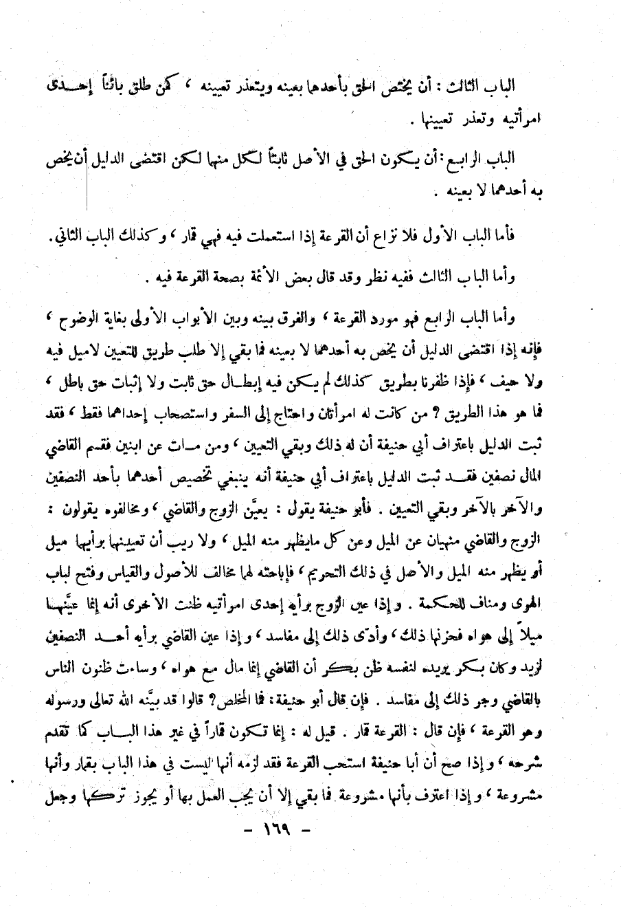 وأما الباب الرابع فهو مورد القرعة، والفرق بينه وبين الأبواب الأولى بغاية الوضوح، فإنه إذا اقتضى الدليل أن يخص به أحدهما لا بعينه فما بقي إلا طلب طريق للتعيين لا ميل فيه ولا حيف، فإذا ظفرنا بطريق كذلك لم يكن فيه إبطال حق ثابت ولا إثبات حق باطل، فما هو هذا الطريق؟ من كانت له امرأتان واحتاج إلى السفر واستصحاب إحداهما فقط، فقد ثبت بالدليل باعتراف أبي حنيفة أن له ذلك وبقي التعيين، ومن مات عن ابنين فقسم القاضي المال نصفين فقد ثبت الدليل باعتراف أبي حنيفة أنه ينبغي تخصيص أحدهما بأحد النصفين والآخر بالآخر وبقي التعيين. فأبو حنيفة يقول: يعين الزوج والقاضي، ومخالفوه يقولون: الزوج والقاضي منهيان عن الميل وعن كل ما يظهر منه الميل، ولا ريب أن تعيينهما برأيهما ميل أو يظهر منه الميل والأصل في ذلك التحريم، فإباحته لهما مخالف للأصول والقياس وفتح لباب الهوى ومناف للحكمة. وإذا عين الزوج برأيه إحدى امرأتيه ظنت الأخرى أنه إنما عينها ميلاً إلى هواه فحزنها ذلك، وأدى ذلك إلى مفاسد، وإذا عين القاضي برأيه أحد النصفين لزيد وكان بكر يريده ظن بكر أن القاضي إنما مال مع هواه، وساءت ظنون الناس بالقاضي وجر ذلك إلى مفاسد. فإن قال أبو حنيفة: فما المخلص؟ قالوا قد بينه الله تعالى ورسوله وهو القرعة، فإن قال: القرعة قمار. قيل له: إنما تكون قماراً في غير هذا الباب كما تقدم شرحه، وإذا صح أن أبا حنيفة إستحب القرعة فقد لزمه أنها ليس في هذا الباب بقمار وإنها مشروعة، وإذا اعترف بأنها مشروع فما بقي إلا أن يجب العمل بها أو يجوز تركها وجعل