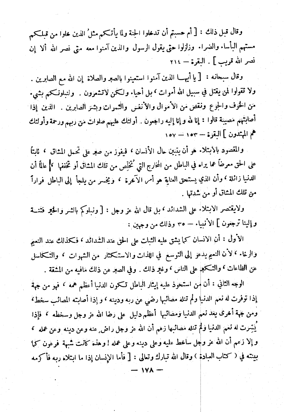 وقال سبحانه: [يَا أَيُّهَا الَّذِينَ آمَنُوا اسْتَعِينُوا بِالصَّبْرِ وَالصَّلاةِ إِنَّ اللَّهَ مَعَ الصَّابِرِينَ وَلا تَقُولُوا لِمَنْ يُقْتَلُ فِي سَبِيلِ اللَّهِ أَمْوَاتٌ بَلْ أَحْيَاءٌ وَلَكِنْ لا تَشْعُرُونَ. وَلَنَبْلُوَنَّكُمْ بِشَيْءٍ مِنَ الْخَوْفِ وَالْجُوعِ وَنَقْصٍ مِنَ الْأَمْوَالِ وَالْأَنْفُسِ وَالثَّمَرَاتِ وَبَشِّرِ الصَّابِرِينَ. الَّذِينَ إِذَا أَصَابَتْهُمْ مُصِيبَةٌ قَالُوا إِنَّا لِلَّهِ وَإِنَّا إِلَيْهِ رَاجِعُونَ. أُولَئِكَ عَلَيْهِمْ صَلَوَاتٌ مِنْ رَبِّهِمْ وَرَحْمَةٌ وَأُولَئِكَ هُمُ الْمُهْتَدُونَ] البقرة: 153 - 157
