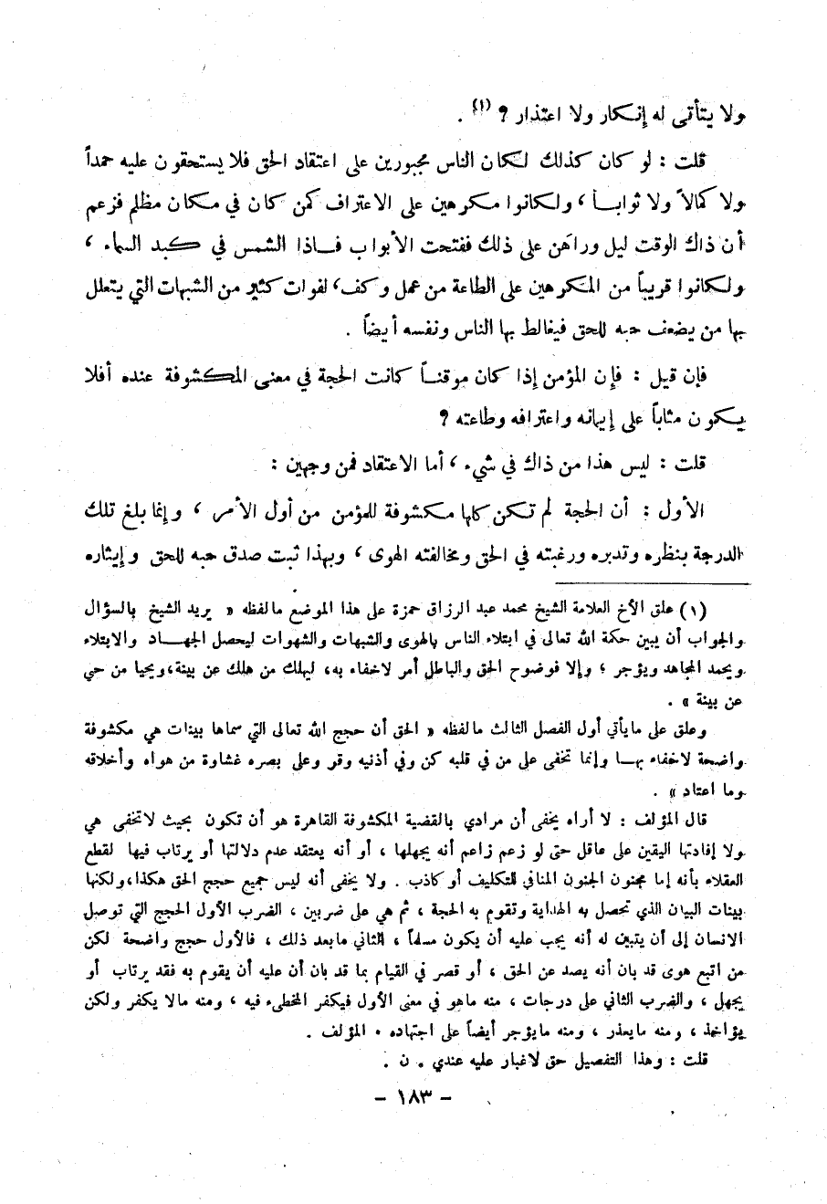 ... قال المؤلف : لا أراه يخفى أن مرادي بالقضية المكشوفة القاهرة هو أن تكون بحيث لا تخفى هي ولا إفادتها اليقين على عاقل حتى لو زعم زاعم أنه يجهلها ، أو أنه يعتقد عدم دلالتها أو يرتاب فيها لقطع العقلاء بأنه إما مجنون الجنون المنافي للتكليف أو كاذب . ولا يخفى أنه ليس جميع حجج الحق هكذا ، ولكنها بينات البيان الذي تحصل به الهداية وتقوم به الحجة ، ثم هي على ضربين ، الضرب الأول الحجج التي توصل الإنسان إلى أن يتبين له أنه يجب عليه أن يكون مسلماُ ، الثاني ما بعد ذلك ، فالأول حجج واضحة لكن من أتبع هوى قد بان أنه يصد عن الحق ، أو قصر في القيام بما قد بان أن عليه أن يقوم به فقد يرتاب أو يجهل ، والضرب الثاني على درجات ، منه ما هو في معنى الأول فيكفر المخطئ فيه ، ومنه ما لا يكفر ولكن يؤاخذ ، ومنه ما يعذر ، ومنه ما يؤجر أيضاً على إجتهاده . المؤلف