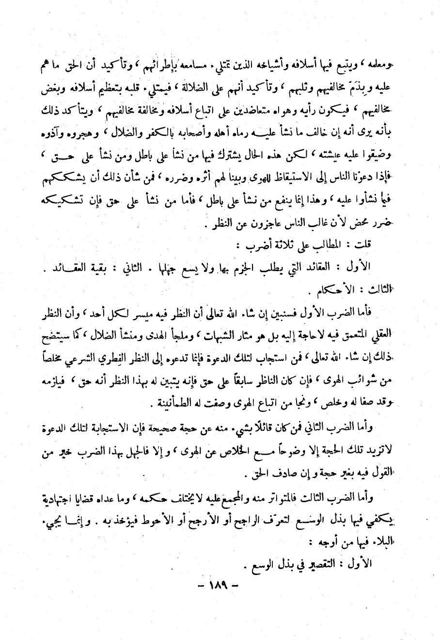 الأول : العقائد التي يطلب الجزم بها ولا يسع جهلها . الثاني : بقية العقائد .الثالث : الأحكام .
