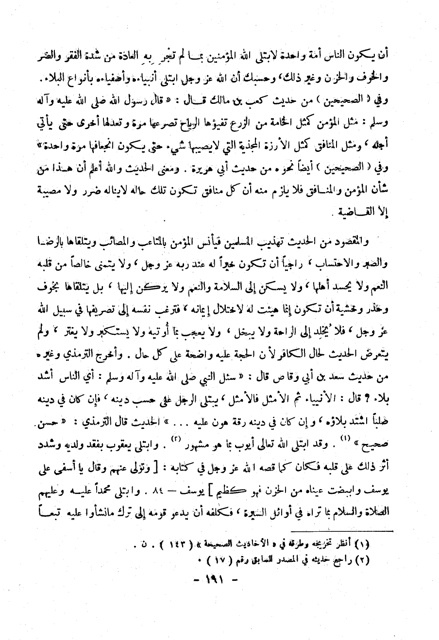 المقصود من الحديث تهذيب المسلمين فيأنس المؤمن بالمتاعب والمصائب ويتلقاها بالرضا والصبر والاحتساب، راجياً أن تكون له عند ربه عز وجل، ولا يتمنى خالصاً من قلبه النعم ولا يحسد أهلها، ولا يسكن إلى السلامة والنعم ولا يركن إليها، بل يتلقاها بخوف وحذر وخشية أن تكون إنما هيئت له لاختلال إيمانه، فترغب نفسه إلى تصريفها في سبيل الله عز وجل، فلا يخلد إلى الراحة ولا يبخل، ولا يعجب بما أوتيه ولا يستكبر ولا يغتر، ولم يتعرض الحديث لحال الكافر لأن الحجة عليه واضحة على كل حال. وأخرج الترمذي وغيره من حديث سعد بن أبي وقاص قال ((سئل النبي صلى الله عليه وآله وسلم: أي الناس أشد بلاء؟ قال: الأنبياء ثم الأمثل فالأمثل،، يبتلى الرجل على حسب دينه، فإن كان في دينه صلباً اشتد بلاؤه، وإن كان في دينه رقة هون عليه ... )) الحديث قال الترمذي: ((حسن صحيح)) (1) وقد ابتلى الله تعالى أيوب بما هو مشهور (2). وابتلى يعقوب بفقد ولديه وشدد أثر ذلك على قلبه فكان كما قصه الله عز وجل في كتابه: [وَتَوَلَّى عَنْهُمْ وَقَالَ يَا أَسَفَى عَلَى يُوسُفَ وَأبيضَّتْ عَيْنَاهُ مِنَ الْحُزْنِ فَهُوَ كَظِيمٌ] يوسف:84. وابتلى محمداً عليه وعليهم الصلاة والسلام بما تراه في أوائل السيرة، فكلفه أن يدعو قومه إلى ترك ما نشأوا عليه تبعاً